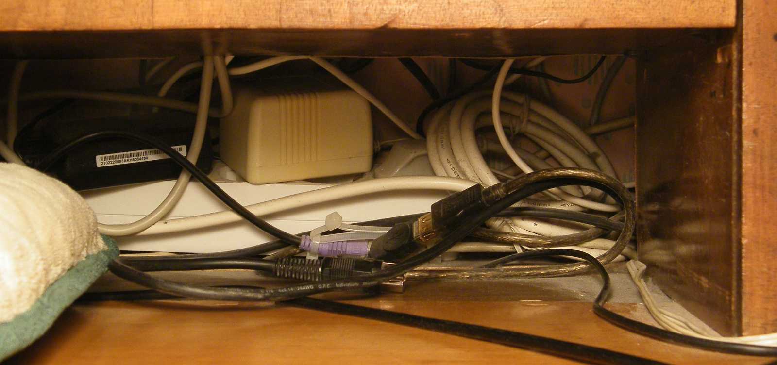 Miután nem találtam, már kezdtem magamnak gyanús lenni, hogy a múltkori gépátépítéskor valamiért kifűztem, aztán nem építettem vissza, de szerencsére csak annyi történt, hogy a keresett USB kábel vége (a hossza miatt) a másik sarokban hempergett. |