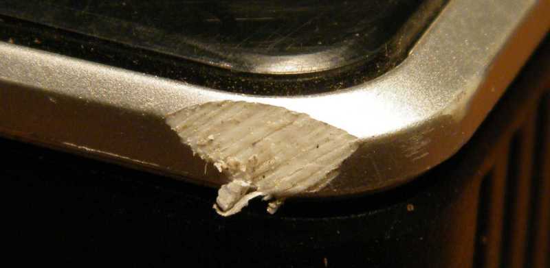 A készülék teljes hibátlanságáról persze szó sincs, hiszen mint az látható, valaki sikeresen belereszelt a doboz szélébe. Az persze lehet, hogy egyszerűen csak tolta a földön. |