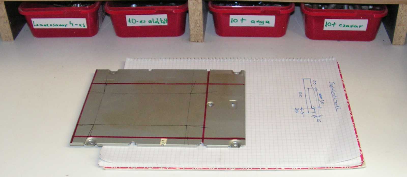 Ha sokat nem is haladt előre a project a legutóbbi belekapásom óta, de legalább annyit igen, hogy végre lehoztam a pincébe a kiválasztott lemezdarabot. Hogy talán jobb lett volna még odafent megrajzolni rá a vonalakat? Ez ugyan igaz, csakhogy az is, hogy a lakásban nincs derékszögű vonalzó. |