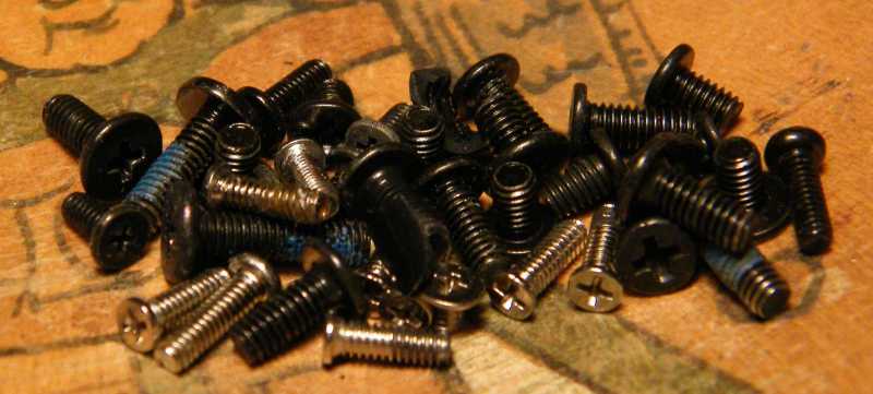 Melyek közül az egyik ennyire hosszú volt. Ebben az a gond, hogy ha az ember nem jegyzi meg, hogy ez hol volt, akkor később (mármint majd összerakáskor) máshová betekerve, az oda hosszra nem illő csavar simán kihozza a gépház műanyagából a menetes betétet. Ez amúgy ezzel a géppel sajnos már akkor is megtörténik, ha a helyére passzoló csavart tekerem vissza, mert elérett a műanyag, s mintha ez lenne a dolguk, úgy fordulnak ki a lyukakból a menetes betétek. |