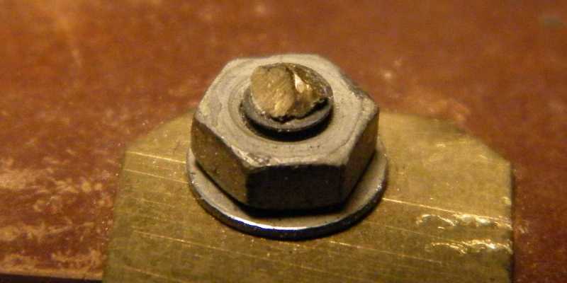 Na ez az a részlet, ami a fűtőszálat megfeszítette. Már persze csak addig, míg a váz szélébe fúrt lyukban benne volt a rugó, ami a rézrúdnál fogva tolta el magától az izzószál befogására szolgáló idomot. |