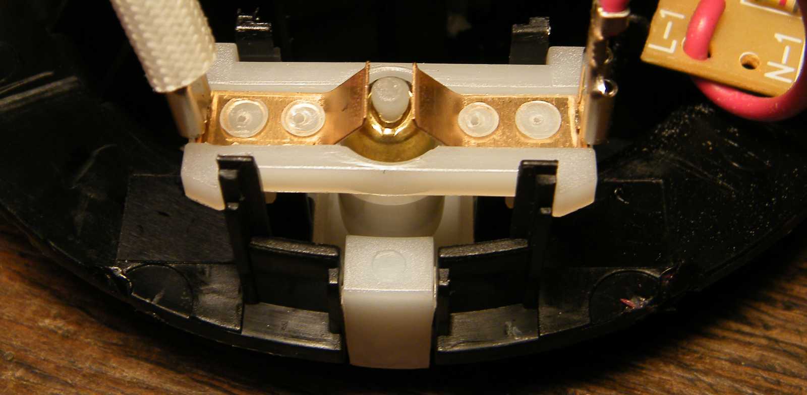Ez pedig a power kapcsoló, amit az egyik fehér pöcök nyom meg. Vagyis ezt a gépet az kapcsolja be, ha rátesszük az aljára, amiben a szétszaggatandó akármik vannak, majd az egész felépítményt egy kicsit megnyomjuk. |