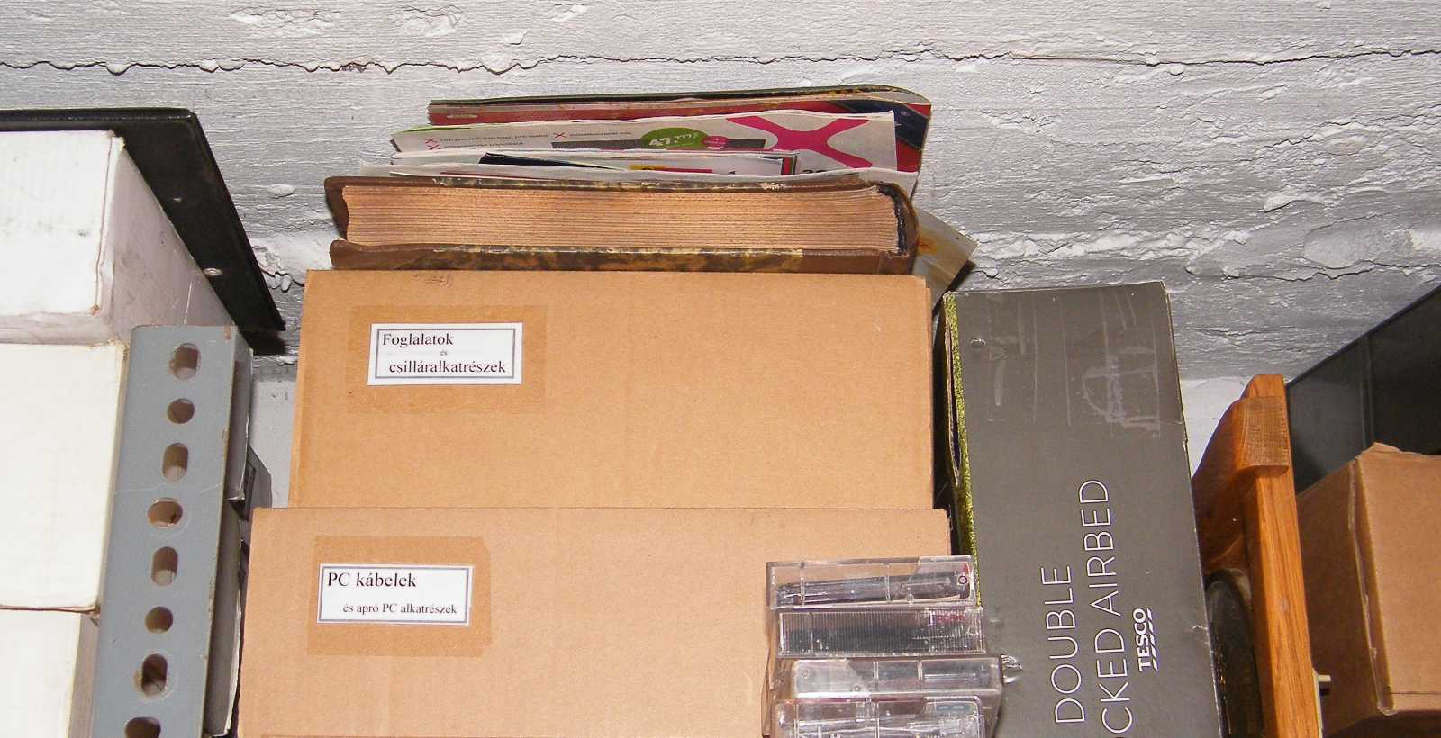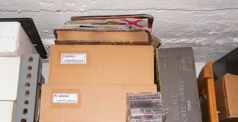 Bár ezt külön nem fényképeztem le (korábban, még a mai cikk keretében igen, de mire ideértem az írásban, addigra ezt már rég elfelejtettem), de attól még úgy volt, hogy ide csak úgy tudtam belépni, hogy az itt lévő két hatalmas, pláne jól megtömött papírdobozokat egy kissé széthúztam, hogy beférjen közéjük a lábam, különben nem tudtam volna őket átlépni. Bemászni amúgy azzal az elhatározással másztam be, hogy vagy a Sokol 308-ast, vagy a VEF 222-est, ha a fene fenét eszik is, illetve még ha elborítanak is a lomok, akkor is előtúrom. |