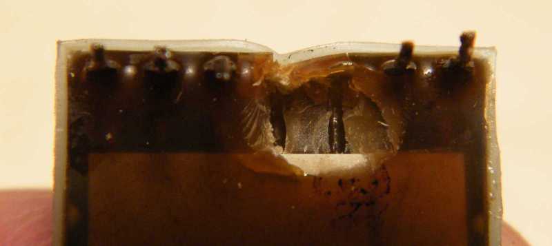 Míg az IC-ről letördelt koromréteg alatt a tulajdonképpen IC látszik.