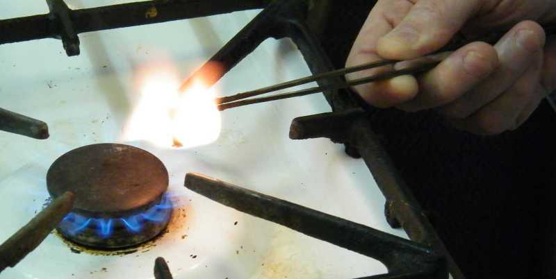 Csak aztán sajnáltam rajta befeketíteni a krómozást, ezért inkább áttértem arra a már amúgy is eleve fekete konyhai csipeszre, amivel mondjuk az éppen tűzforró lángelosztót lehet a gázrózsáról félrehúzni. Míg a kék láng a gázé, addig a sárgát az IC-ről leégő műgyanta adta. |