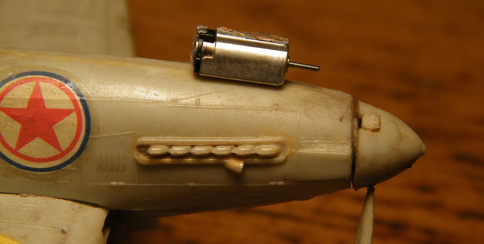 Rátéve a modell orrára, mindjárt kiderült, hogy ha be szeretném építeni (amúgy nem szeretném, csak gondoltam megemlítem ezt a lehetőséget), akkor nem azzal lenne gondom, hogy befér-e, vagy sem, hanem azzal, hogy támszerkezetet kell hozzá építenem. Mondjuk ha vastag, értsd legalább átmérő 0,5-ös drótból lenne az elektromos hozzávezetés, akkor a motor aprósága okán az is simán megtartaná. |