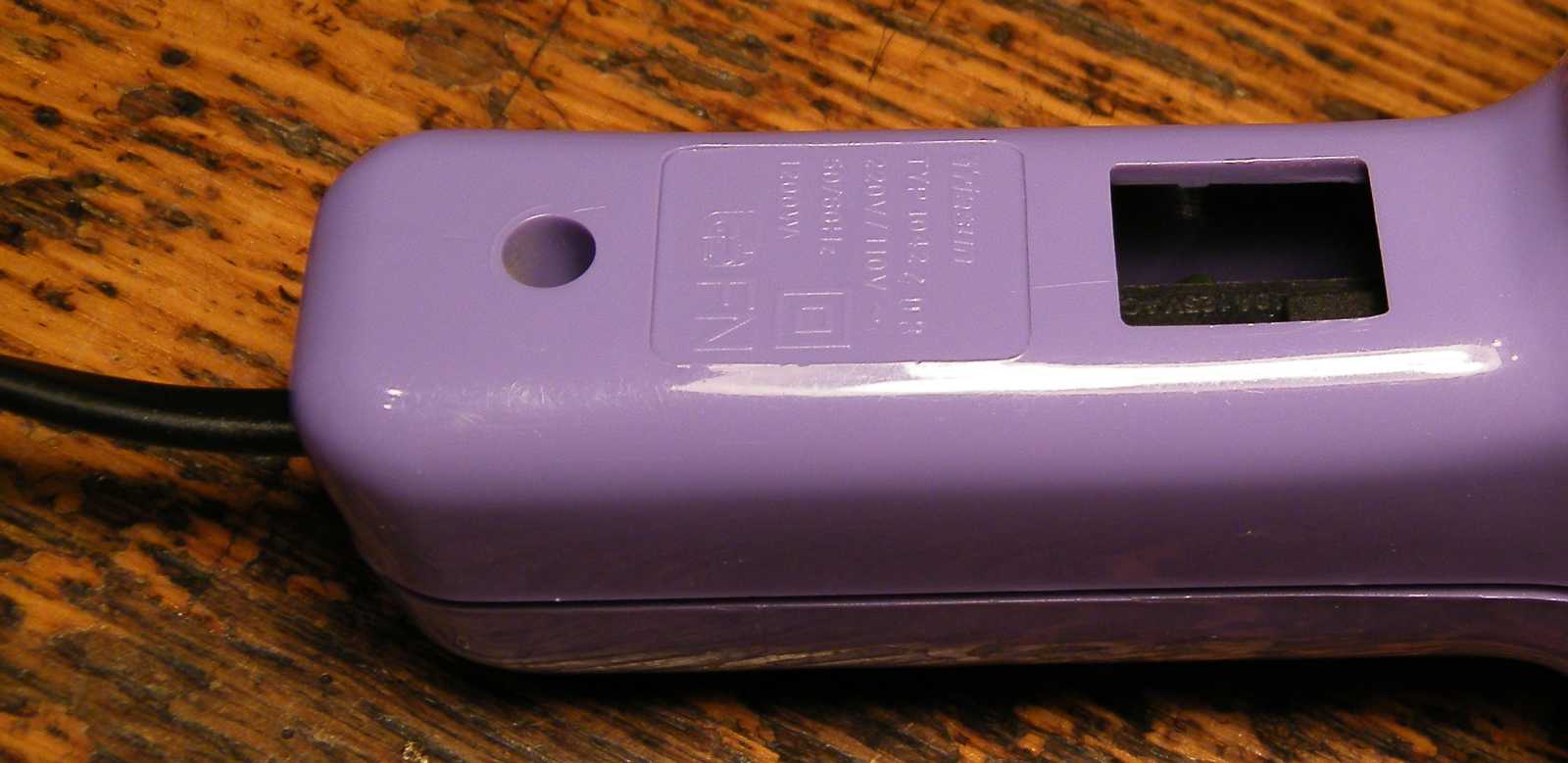 Ezen kép kapcsán egyrészt a hálózati feszültségváltót említeném meg, amit (emlékezetem szerint legalábbis) hajszárítón én még sosem láttam, másrészt a kapcsoló alatti vékony vonal a lila műanyagon, az nem repedés, hanem csak a fröccsöntő szerszám nyoma. |