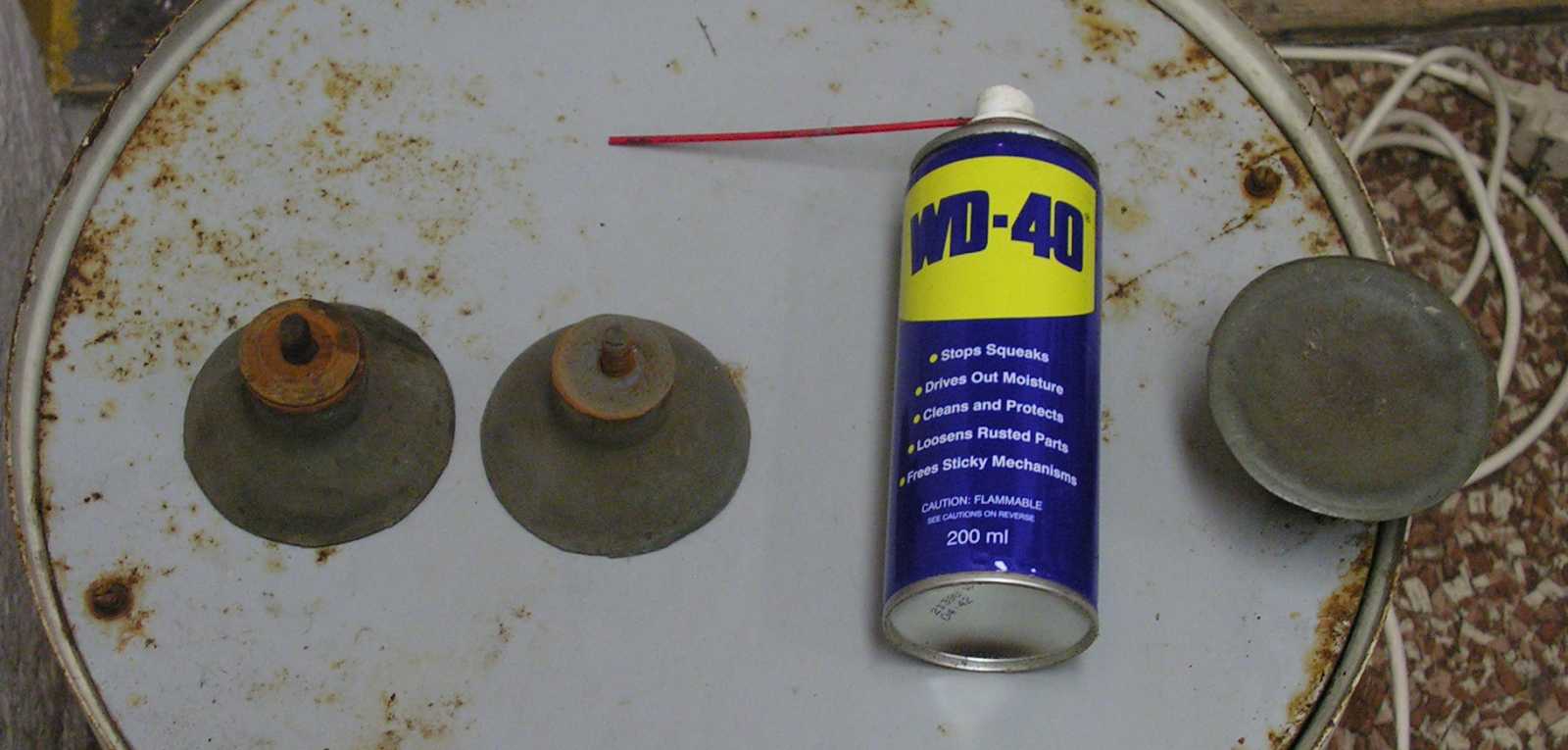 Míg két gumiláb lazán kiforgatható volt, addig a harmadik néhány fordulat után elakadt, mire fel befújtam alá egy kis WD40-et. Gondoltam egy kis kenés majd biztosan használ a rozsdás meneteknek. |