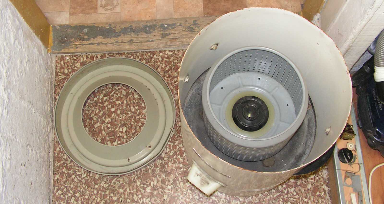 Nemcsak azért beteg, mert hiányzik a teteje, hanem azért is, mert mint az látszik is, félre van benne billenve a dob. A miénk amúgy felülről nem ilyen volt, hanem levehető tetejű. Ennek mondjuk már hiányzik a teteje, de a zsanérból azért látszik, hogy ez már nem a levehető fém, hanem a felhajtható műanyag tetejű változat. |