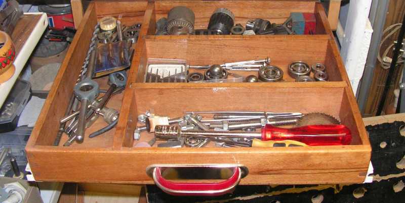 Mivel a múltkor berágtam, hogy mindig elő kell vennem a készletet (no nem mintha el lenne dugva a hátam mögötti polcon), tettem néhány fúrót és metszőt ebbe a fiókba is. |