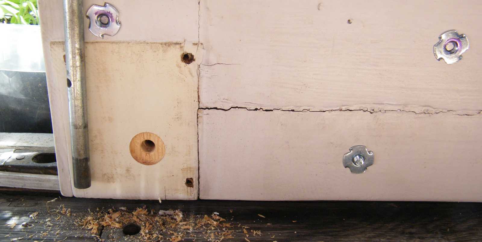 Mikor a nem szak, hanem csak úgy egyszerűen barkácsoló ember azt hiszi, hogy az adott részlet kész, jöhet a következő fázis, igen gyakran közbejön valami. Most például a bal oldali ajtószárny aljáról amúgy le sem szedett esővető léc és az általam még évekkel ezelőtt merevítésül felszerelt deszka közötti rés jött közbe, amit az egyszerűség jegyében melegtakonnyal töltöttem fel. |