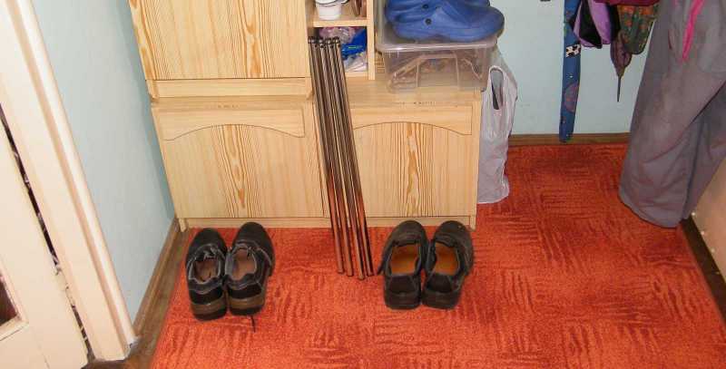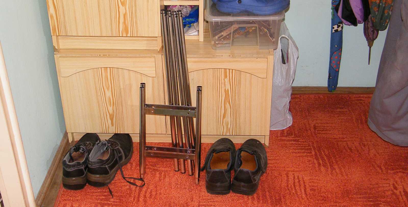 Hogy a cipőtartó mondjuk takarítás közbeni rakosgatása közben a lábak toldó csövei ne essenek le a helyükről, kezdetben a megnyomorításukban gondolkodtam, mely ötletem kisvártatva egy-egy menetnyi szigetelőszalag feltekerésére szelídült. |
