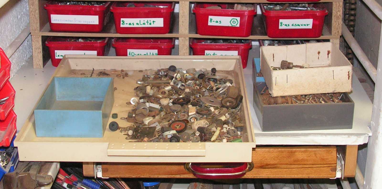 Most például ugyan mikor máskor állhattam volna neki az alátétes dobozokban turkálni, mikor épp nagyban folyik a dobozborogatós projekt, ami az adott pillanatra odáig fajult, hogy mindenütt csavaros, anyás és alátétes dobozok hevertek, a szerzőtől egyáltalán csak kitelő kaotikus összevisszaságban. |