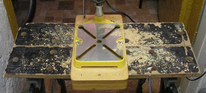 Hogy ne kelljen vele megvárnom a fűrészlapot kitámasztó csapágyas projektet, majd távol vágok a vonalaktól, a maradékot pedig lecsiszolom, így pontosan 90 fokos lesz a csapágyházak minden oldala, és még - persze a lehetőségeimhez képest - egyformák is lesznek. Mielőtt ezt megtenném, előbb persze még kifúrom az anyagon az összes lyukat. Mármint azért, mert mikor még egyben van az anyag, akkor sokkal jobban kézben tartható. Valószínűleg úgy lesz, hogy a fúrás idejére alácsavarozok egy értéktelen bútorlapot, és akkor nem szakad szét a furatok széle. |