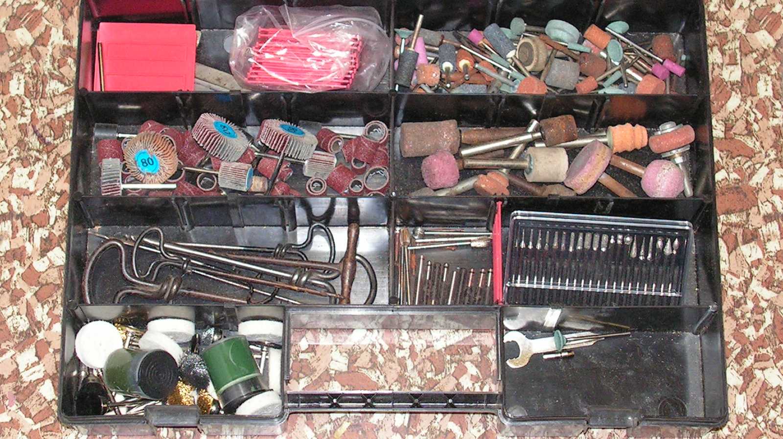 Miután a fiókjaimban kissé alaposabban körbenéztem, ebben a másik rekeszben megláttam a fogtechnikai marógép patronjait, valamint - bár csak az éle látszott - a tokmányához tartozó spéci kulcsot is. |