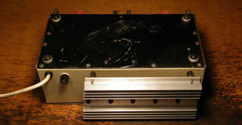 Amit a belsejét nem látva el tudok róla mondani, az az, hogy bár működött, azonban annyira elégedetlen voltam vele, hogy egyszer hirtelen haragomban nekiálltam és átépítettem az egészet. Mármint kikaptam a bizonytalan működésű panelt, építettem helyette egy másikat, valamint lecseréltem a hátlapon található apró hűtőbordát egy sokkalta nagyobbra, ráadásul az eredeti 2N3055-ös tranyó helyett is négy párhuzamosan kapcsolt került beépítésre, természetesen a párhuzamos kapcsolásukhoz szükséges kis értékű emitter ellenállásokkal. |