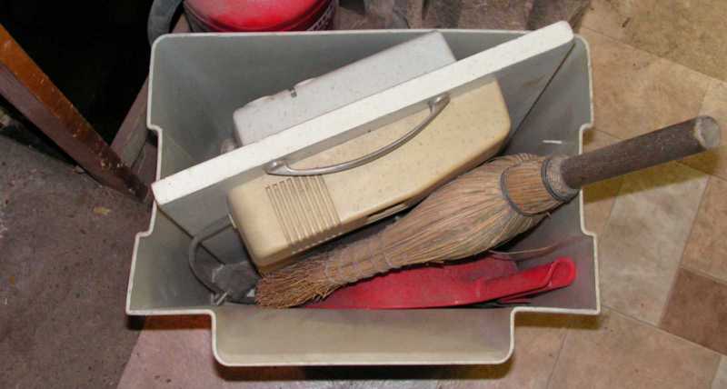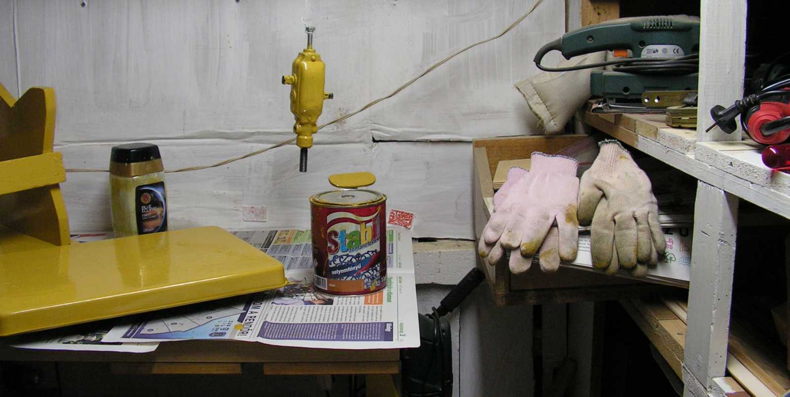 A vékony bádoglemezből szappanöntő forma készült, az újságpapírokon sárgára festek és lakkozok, míg a fadarabokból mára már ki tudja mi készült. Ezek ottléte még csak-csak megokolható, de az, hogy a csiszolópadban (amúgy a szalagcsiszoló helyén) mit kerestek befőttesüvegek, na arra már nehezen találtam magyarázatot. Ha csak nem úgy volt, hogy az adott pillanatban már csak ott volt számukra hely. |