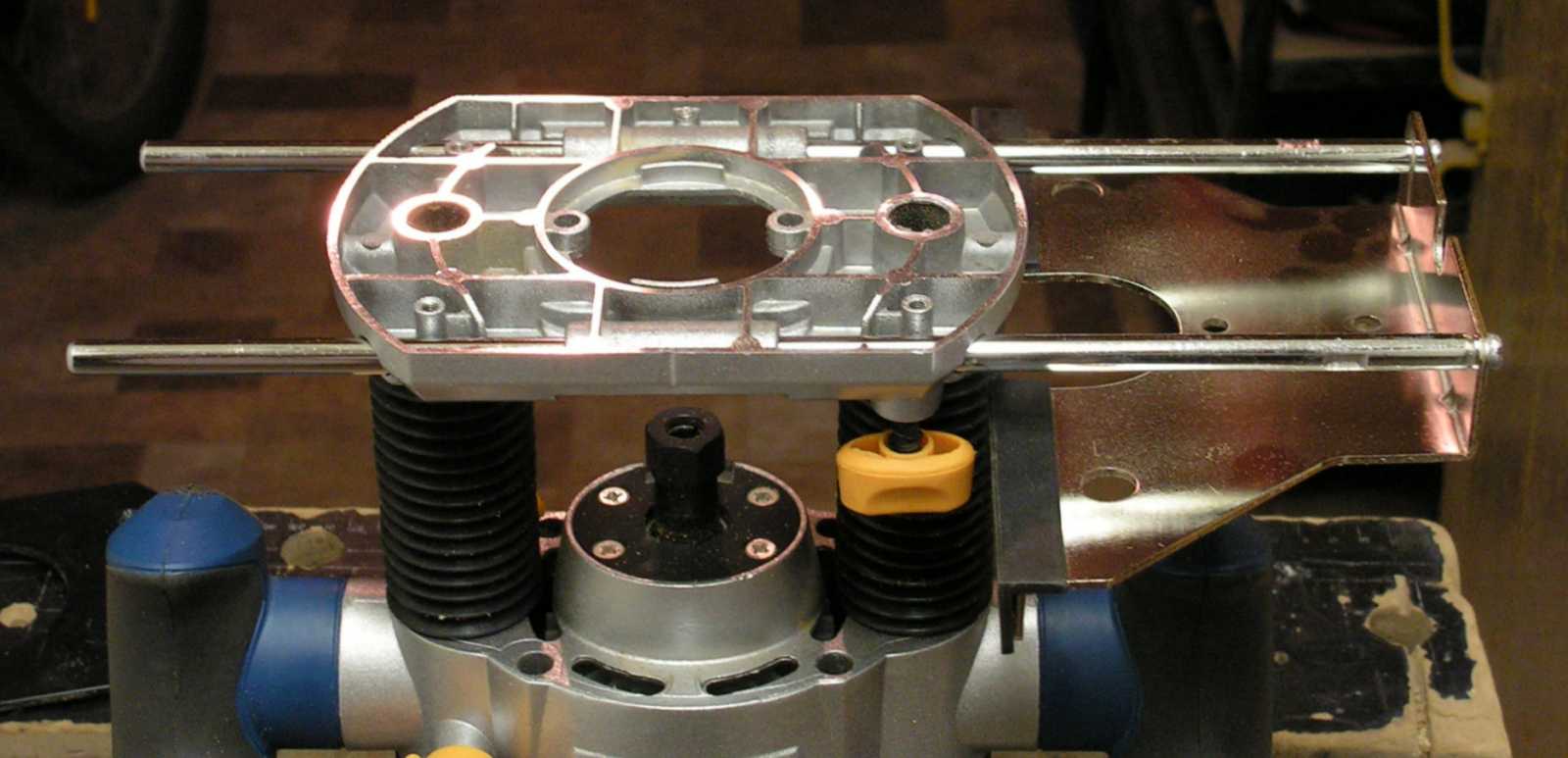 Addig-addig szerencsétlenkedtem, míg csak rá nem jöttem, hogy a gép rögzítését a képen látható pálcákkal is meg lehet oldani. Mármint azoknál fogva is oda lehet fogatni a gépet négy bilinccsel, mondjuk egy bútorlaphoz. Vagy ha nem így, akkor úgy is lehet rögzíteni, hogy a fekete lap helyett készítek egy annál nagyobb lemezt, aminek persze kimarom (mármint besüllyesztem) a helyét a bútorlapban. Vagy ha találok akkora lemezt, hogy az kiadja a gép teljes munkalapját, akkor egyszerűen csak rá kell csavaroznom a gépet. |