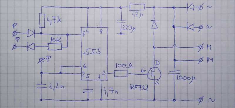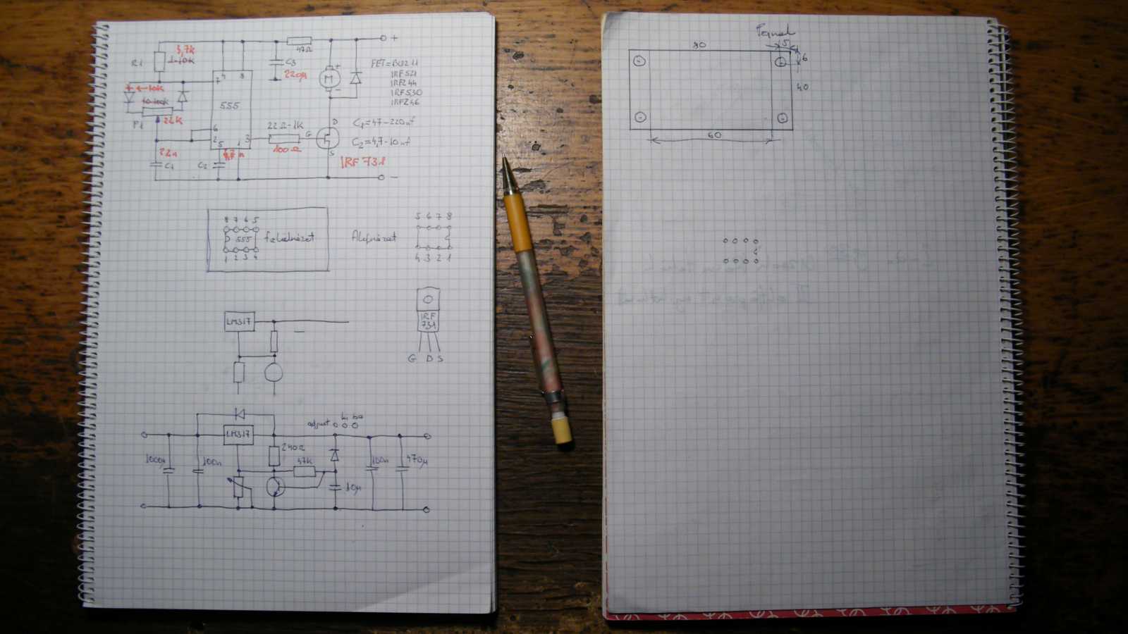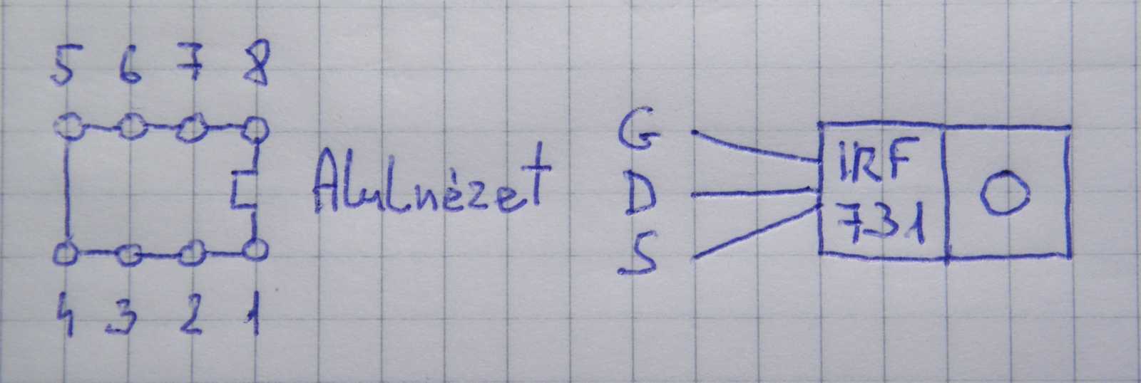 Ettől függetlenül én azért megpróbáltam, de csak odáig sikerült eljutnom, hogy lerajzoltam az 555-ös IC-t alulnézetből, valamint kikerestem a FET lábainak bekötését, mely apróságokat követően azonnal lefordultam a székről. |