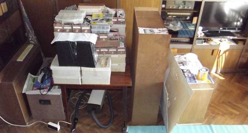 Hiába néz ki úgy, hogy a szekrény tartalma simán (és még stabilan is) felfért az asztalra (amúgy persze felfért), ha egyszer tudom, hogy a kicsi és a nagy szovjet oszcilloszkóp a fásszekrénybe került. Ezzel persze még nincs vége a pakolásnak, mert ott van még a mélyláda, meg az alatta lévő, szintén kipakolandó tartalmú másik szekrény is. |
