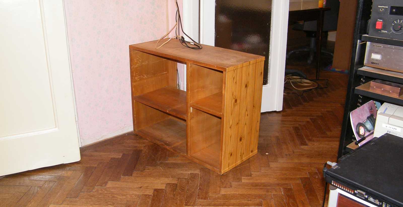 Bár úgy tisztára úgy néz ki, mint ami egy kissé ferdén áll, s ez persze így is van, ez azonban azért nem baj, mert a sarokban ferde alatta a parketta. Vagyis direkt kell a szekrénynek egy kicsit jobbra dőlnie, hogy majd a helyén egyenesen álljon. |