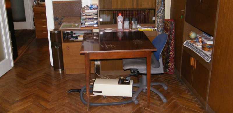 Bár az volt betervezve, hogy a maradék papírt és ragasztót a pincében fogom lecsiszolni, ez végül mégiscsak idefent történt meg. Erre mindjárt két okom is volt. Míg az egyik az volt, hogy délfelé már annyira hasogatott a derekam, hogy még a pincébe sem volt kedvem lemenni (vagy talán inkább nem mertem, nehogy lent maradjak), addig a másik az, hogy a képen látható porszívós csiszológépet direkt azért vettem, hogy különösebb porolás nélkül tudjak a lakásban rendetlenkedni. |