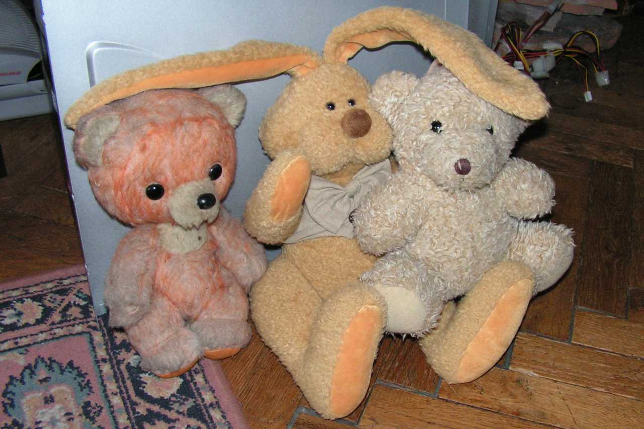 Ma "csak" három medvét kapott az asszony, és még abból is az egyik egy nyúl. Mint az a második képen látható, egyből rájuk vetette magát, majd szépen elrendezte őket. Itt most a jobb oldali maci az érdekes, mert az zenél. Óraműves mechanikus un. zenedoboz van benne, ami persze hol zenél, hol meg nem. Már meg lett fürdetve, és a mosdatása közben is kiszólt néha a csapból. Most a fregolin lóg, de még nincs vége a tortúrának, mert ki lesz belezve a zenegép javításának erejéig. |