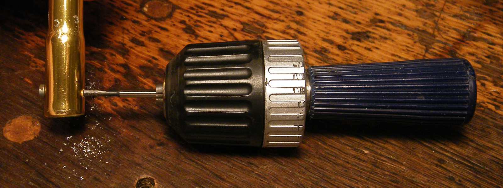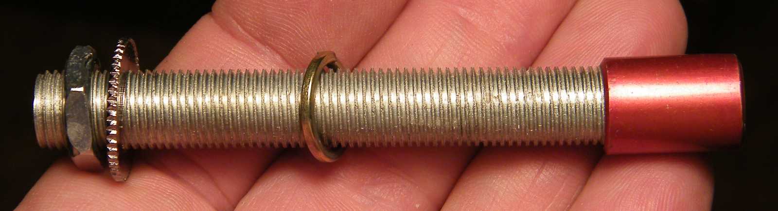 Az aranyszínű csőben a menetes toldót - a szimmetria végett - végül nem egy, hanem két M3-as csavarral rögzítettem. A menetfúrót csak azért kellett a lyukba belehajtani, mert valamelyik csavar vége egy kissé belelógott a belső menetbe. |