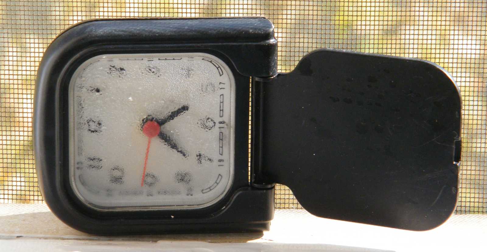 Hogy az időzítőben biztosan ne maradjon víz, pontosabban szólva, hogy ha mégis maradt, akkor lássam, immáron összeszerelve hagytam a napon, de az ő ablaka nem párásodott be. |