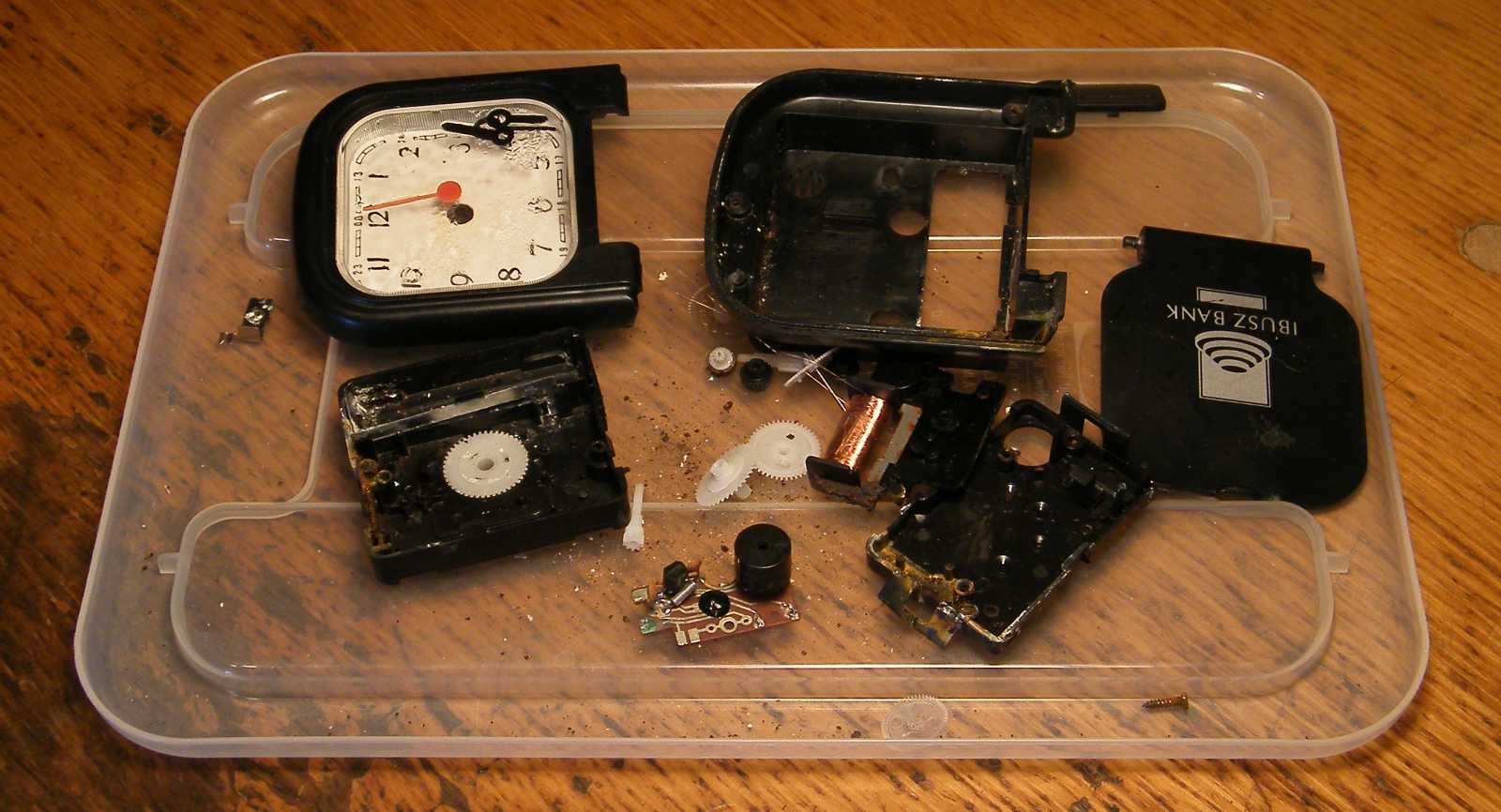 A boncolásra begyűjtött, pláne már rég odakészített hatalmas tárgyak helyett én persze ezt a tenyérben bőven elférő, a pincében szinte semmi helyet sem foglaló apró órát választottam, mely döntésre egyértelműen az volt az ok, hogy ezzel, mivel nemcsak rozsdás, de még az elem is belerohadt, valószínűleg szokatlanul gyorsan fogok végezni. |