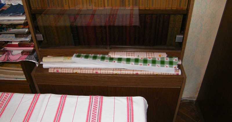 A bútorlap díszítő borításához szükséges viaszos vászon nemhogy van, de egyenesen azért van a könyvszekrény peremén, mert tudtam, hogy majd kell belőle egy darabka a polchoz. Na jó, akkor azért vannak itt, mert még nem találtam meg, hogy hová tudnám őket úgy eldugni, hogy ne gyűrődjenek meg. |