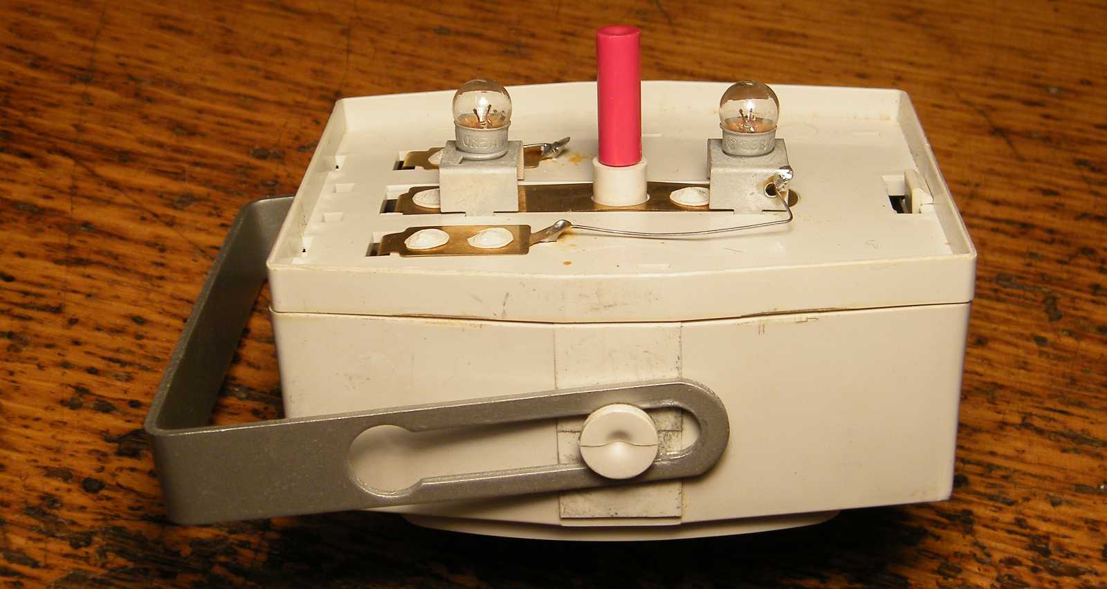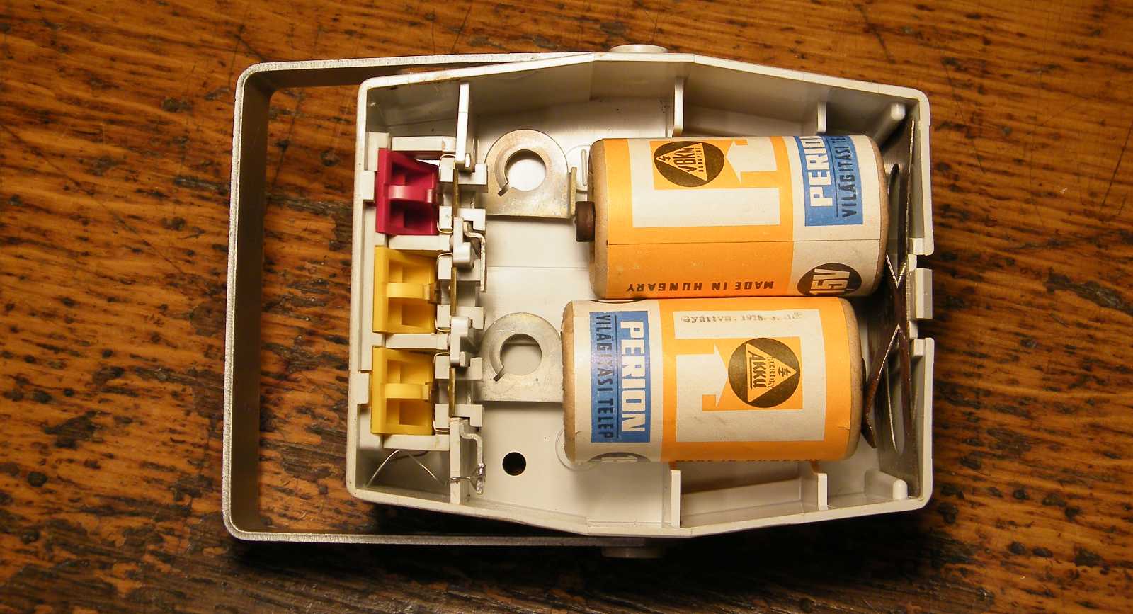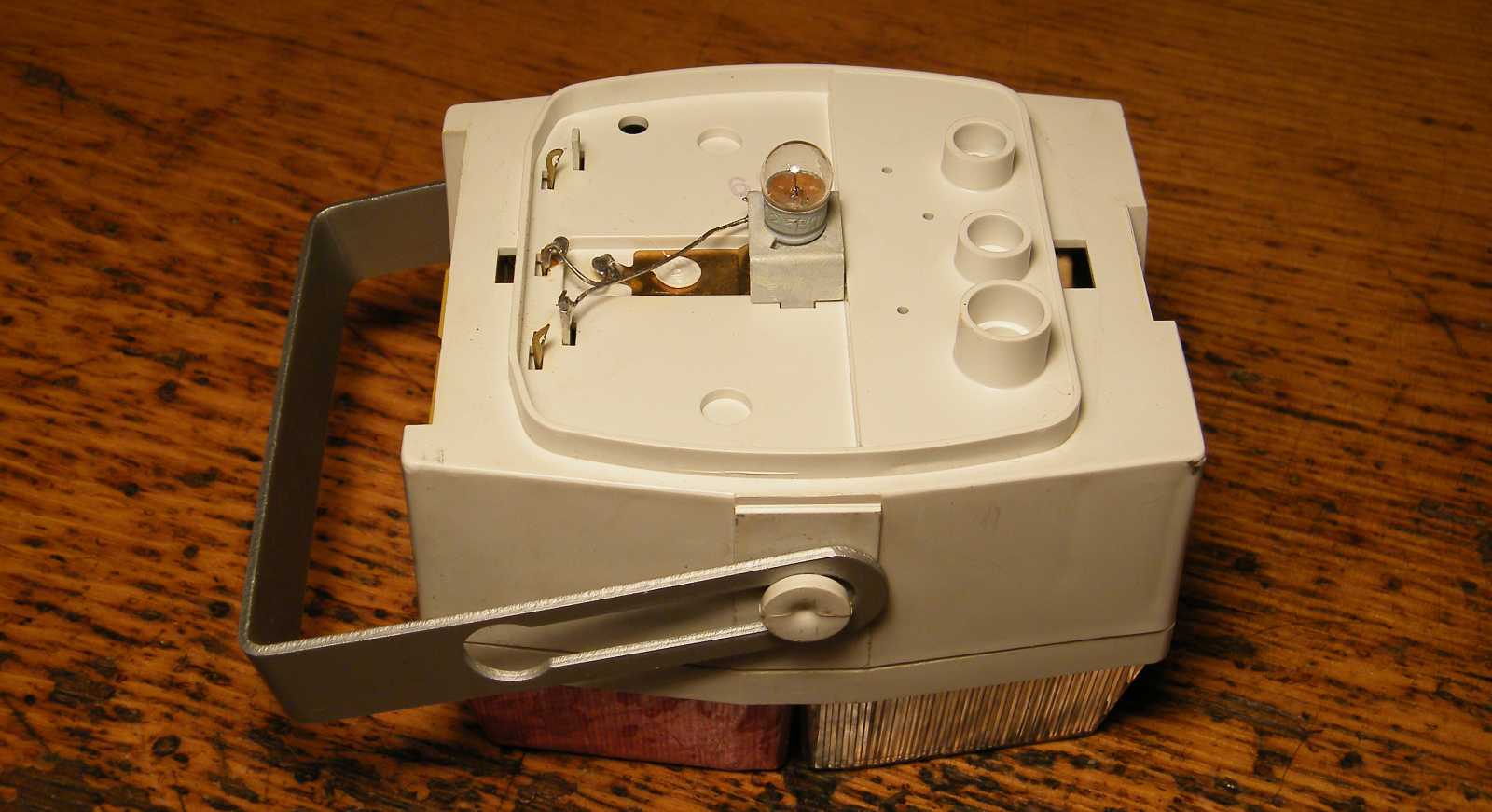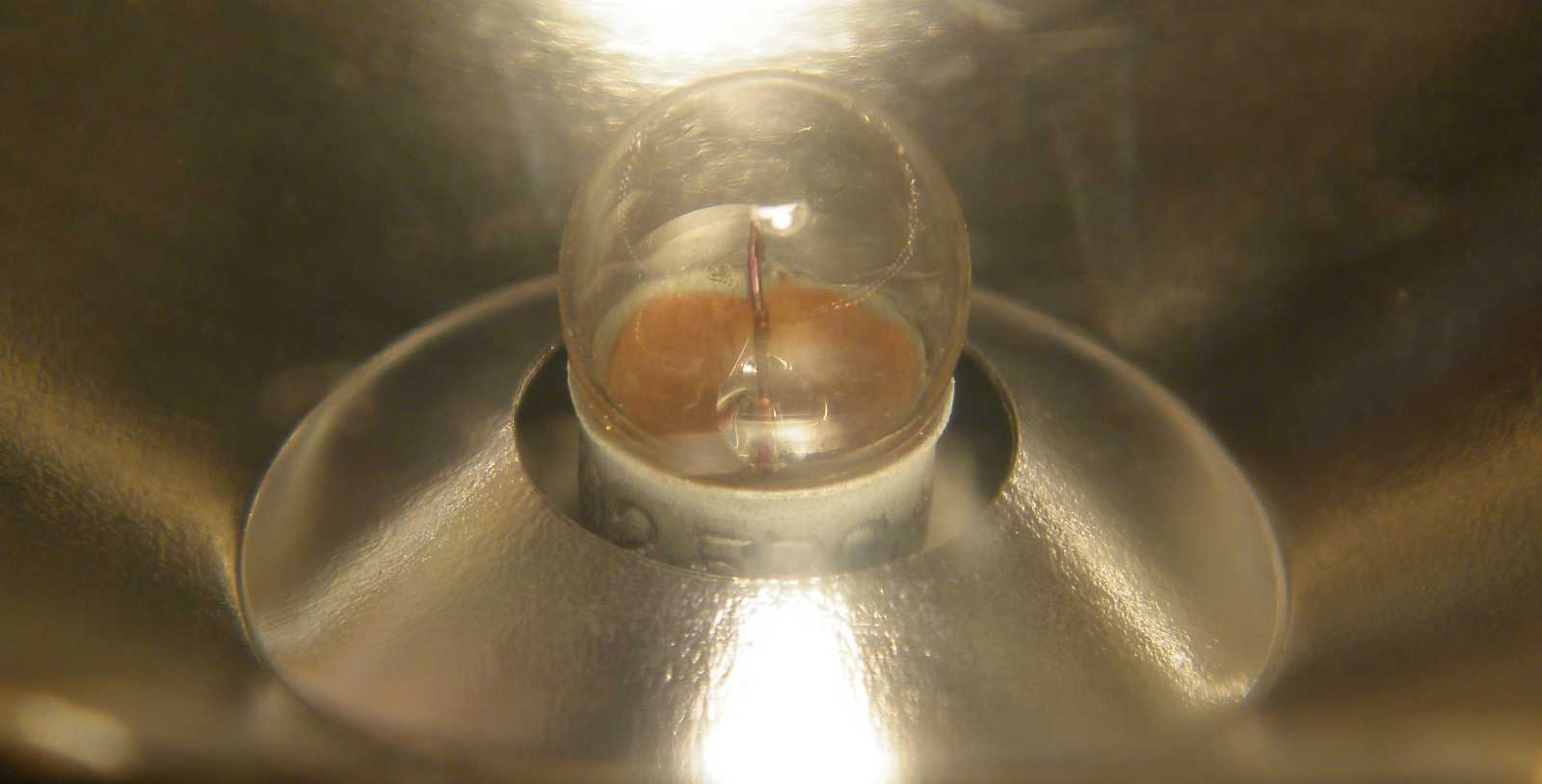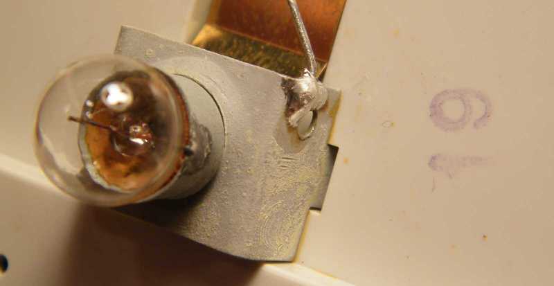 A két jobb oldali üreg annyira tranzisztorhely, hogy teljesen egyértelmű, hogy a lámpa egy másik, értelemszerűen sárga burát is tartalmazó változatánál ide voltak bedugdosva az apró izzót ki-be kapcsoló multivibrátor alkatrészeinek lábai. |