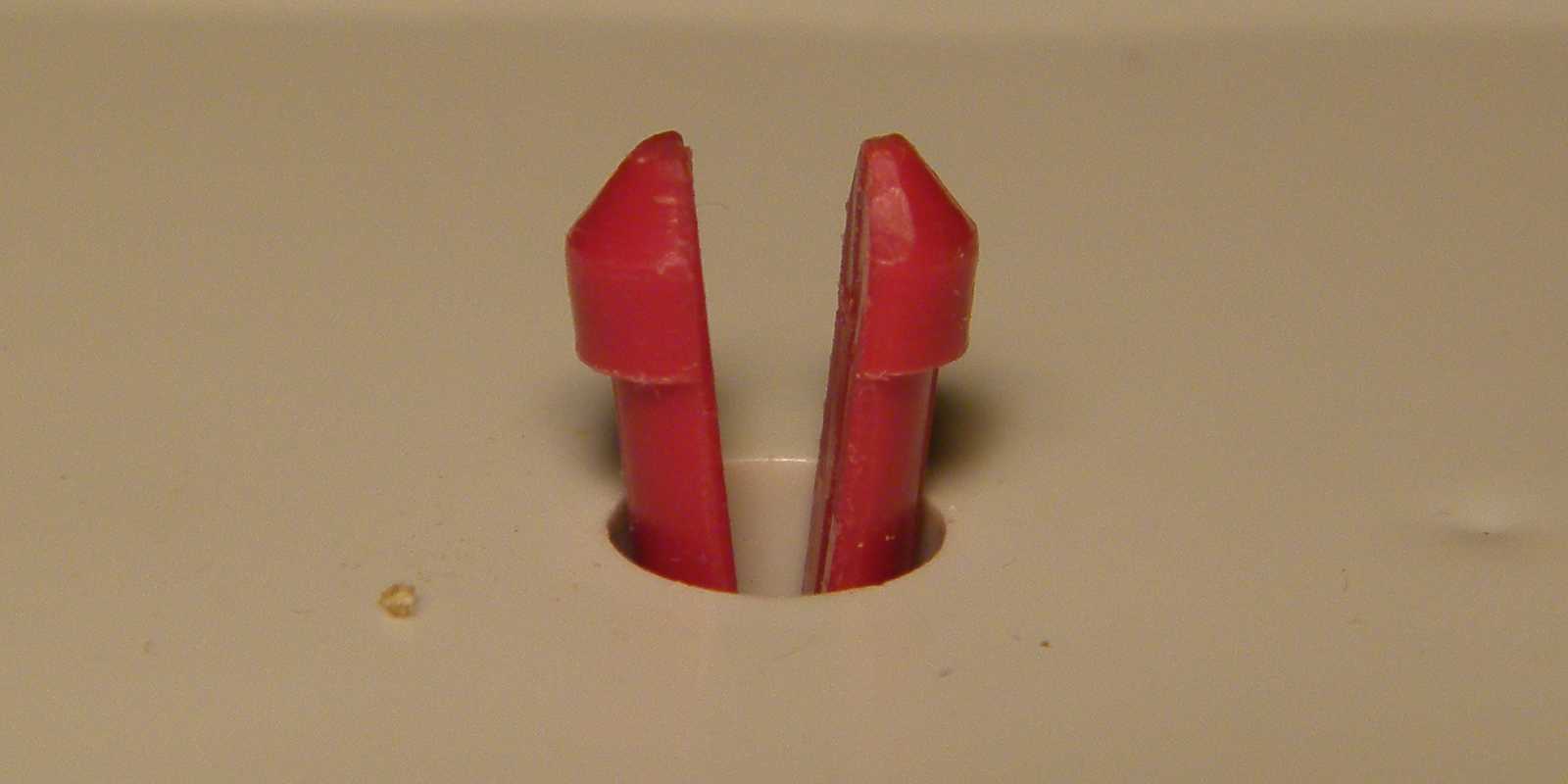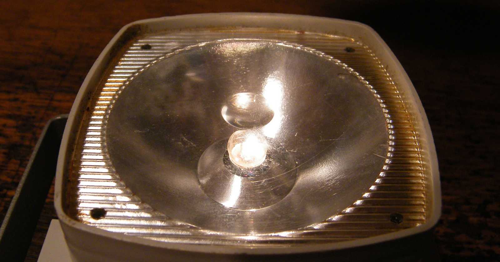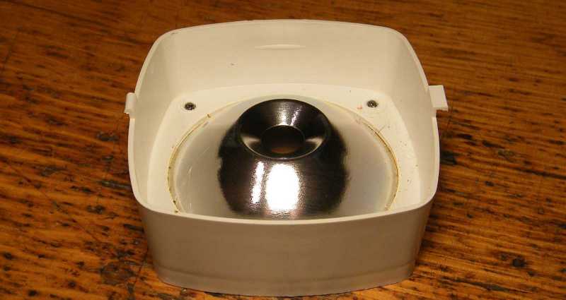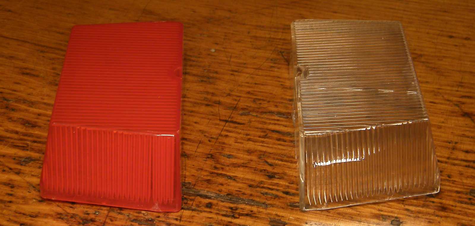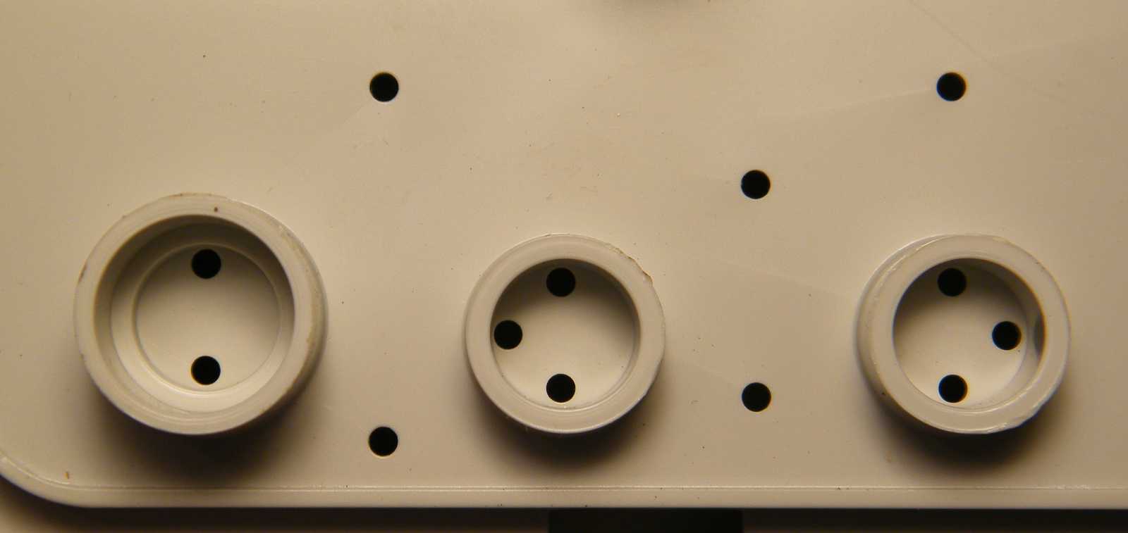 A két jobb oldali üreg annyira tranzisztorhely, hogy teljesen egyértelmű, hogy a lámpa egy másik, értelemszerűen sárga burát is tartalmazó változatánál ide voltak bedugdosva az apró izzót ki-be kapcsoló multivibrátor alkatrészeinek lábai. |
