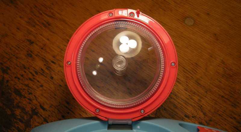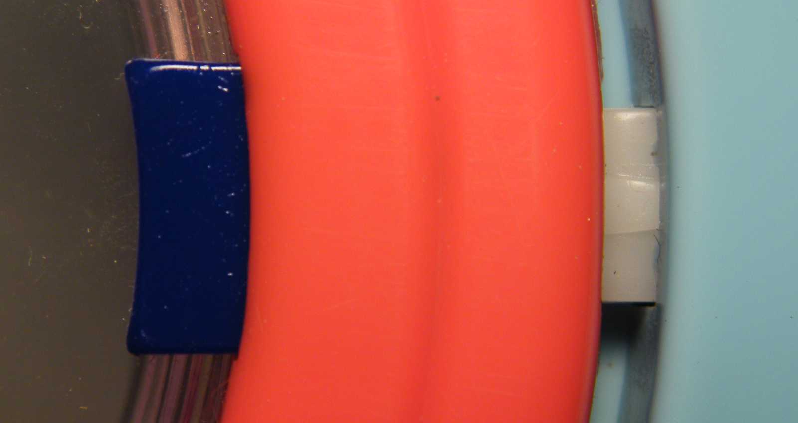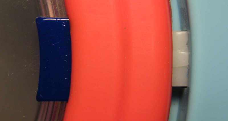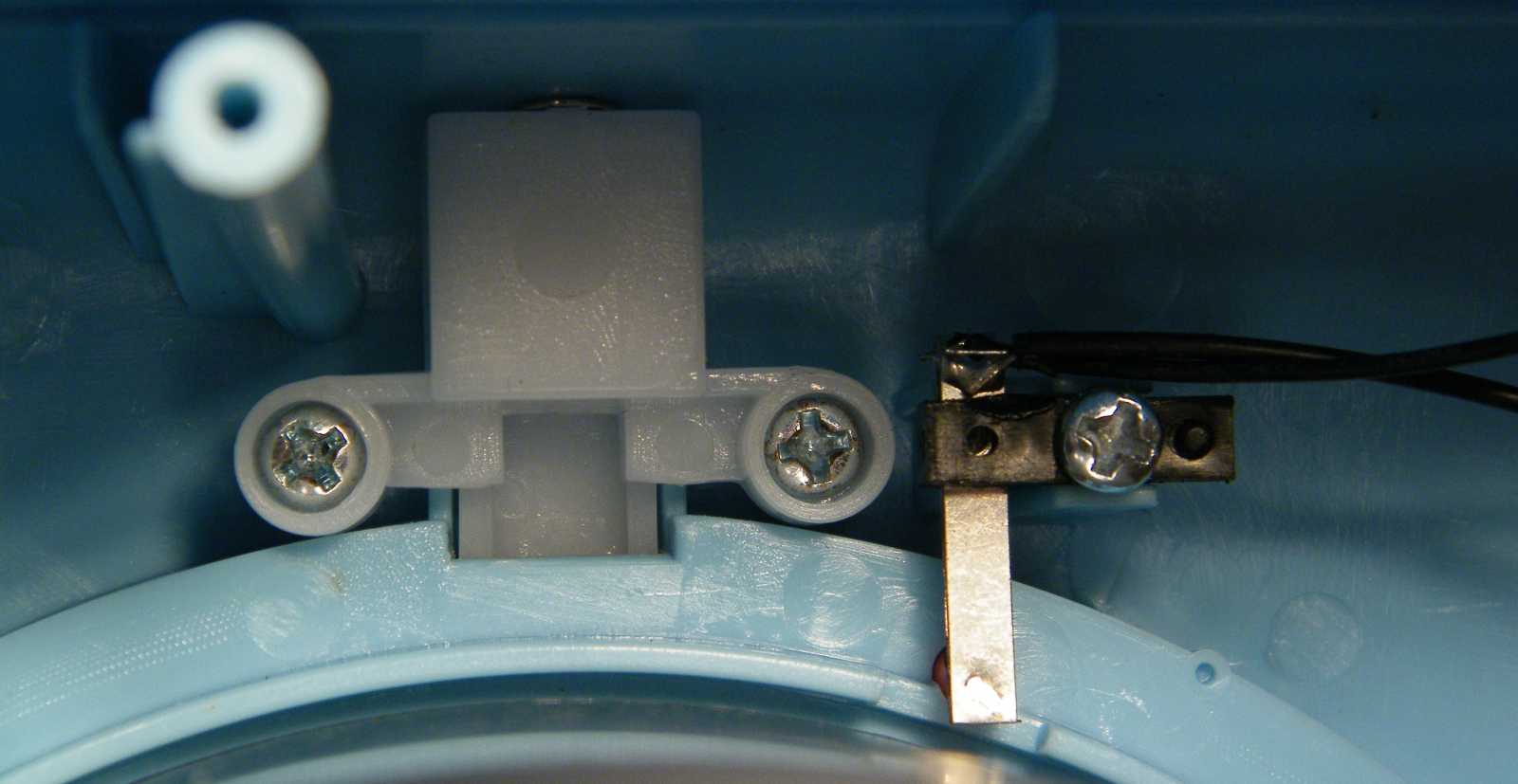 Bár ez csak játék, amit egy gyengécske motor hajt, de attól még van benne biztonsági kapcsoló, nehogy a gyerek nyitott ajtóval indítsa el a gépet, aztán a dobba nyúlva eltörje az ujját. |