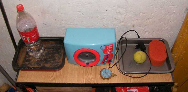 Bár kezdetben csak kettő volt meg a háromból, végül a festékes vödör is előkerült, mégpedig - csodák csodája - az építőanyagos polcról. Hogy a mosógép ne érezze magát egyedül, no meg fogyjanak a kosárból a bemutatnivalók, hoztam mellé egy rézből készültnek tűnő nyomásmérőt is, melynek skálalapja meglepő módon ugyanolyan árnyalatú kék, mint amilyen a mosógép háza. |