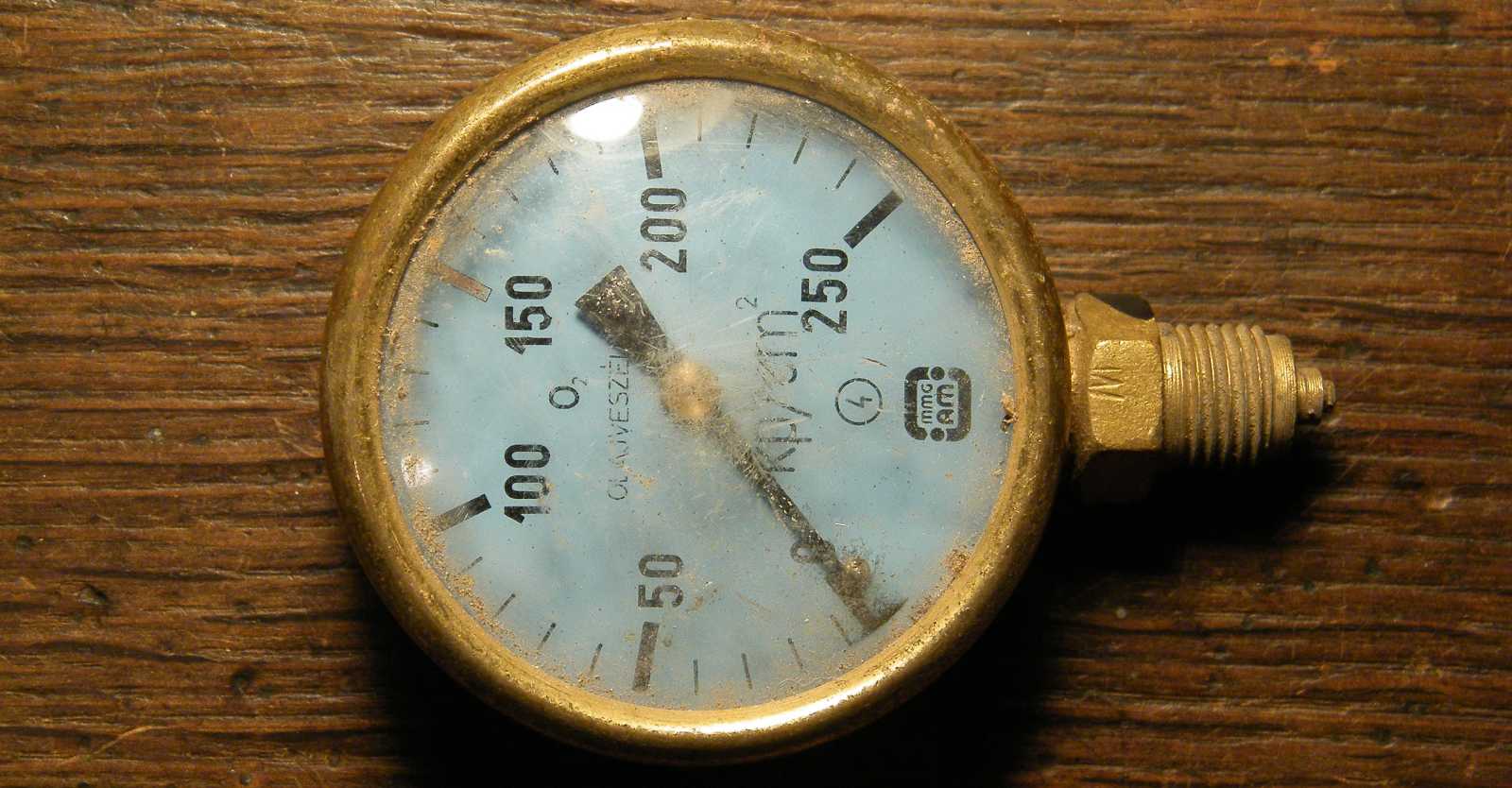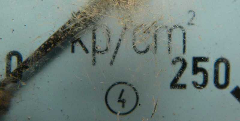 A műszer skálája a nyomást kilopond / négyzetcentiméterben mutatja.