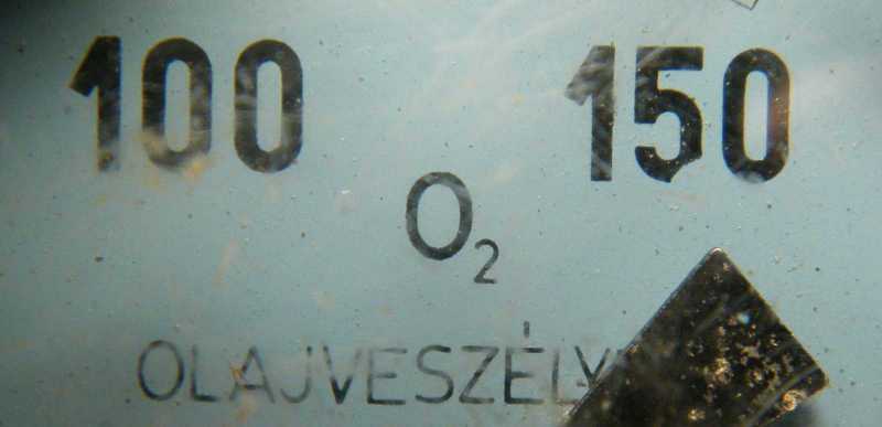 Mivel ez a nyomásmérő oxigénpalackon teljesített szolgálatot, így az olajveszély nem arra utal, hogy olajos lehet tőle a kezünk, hanem arra, hogy ha a műszer tömítésének közelébe olaj, zsír, vagy bármi egyéb éghető szennyeződés kerül, akkor az durván tűzveszélyes. Ez még akkor is igaz, ha nincs a közelben se tűz se parázs, mert az éghető anyagokat a magas oxigénkoncentráció miatt a kiáramló gáz súrlódása is képes begyújtani. |