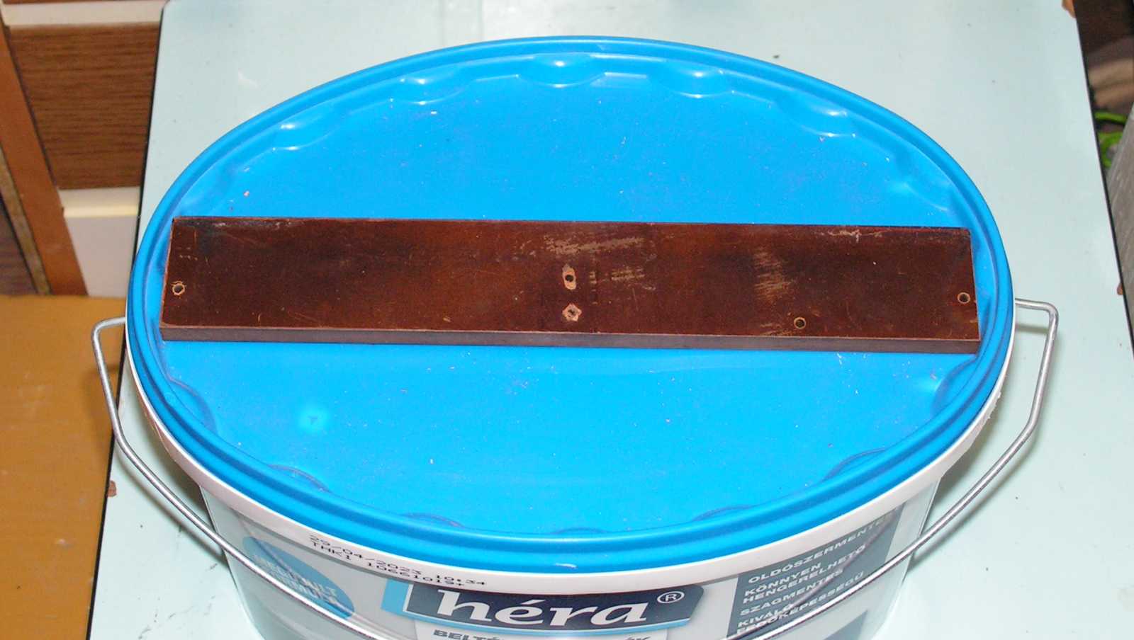 A "megterhelő" jelzőt úgy kell érteni, hogy a kenyérvágódeszkához kiválasztott anyagdarab ekkor már hetek óta hevert odakészítve egy vödör tetejére, de sem leszabni belőle két darabot, sem lyukakat fúrni bele nem volt kedvem, pedig ugye momentán ezt akár most is megtehettem volna. |