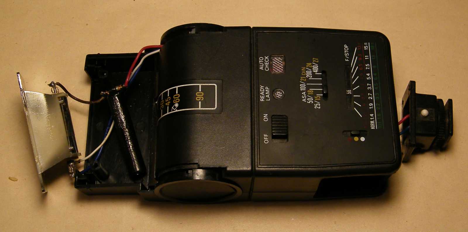 Ezt az alkatrészt két oldalról befeszítve sikerült levennem, ami azért nem volt valami szerencsés történés, mert ezt követően ahová csak lehetett, mindenhova befeszítettem egy, esetleg két csavarhúzóval, mire fel szegény vaku eresztékei rettenetes recsegő hangokat hallattak, pláne el is tört itt ott valami apróság. |