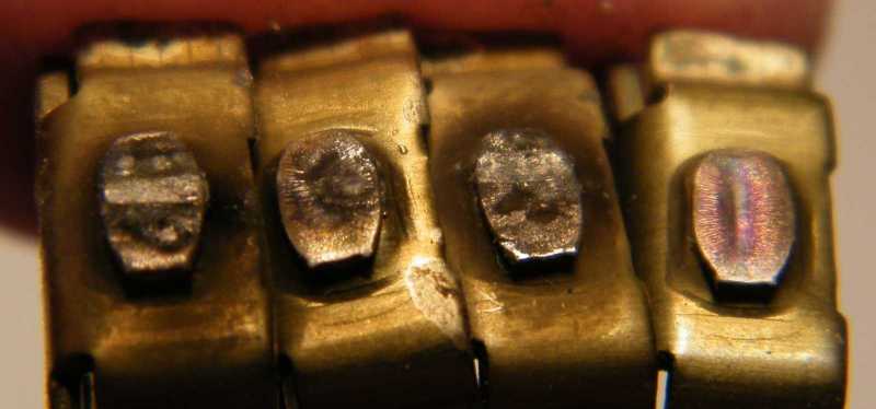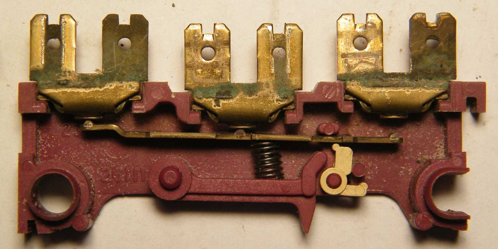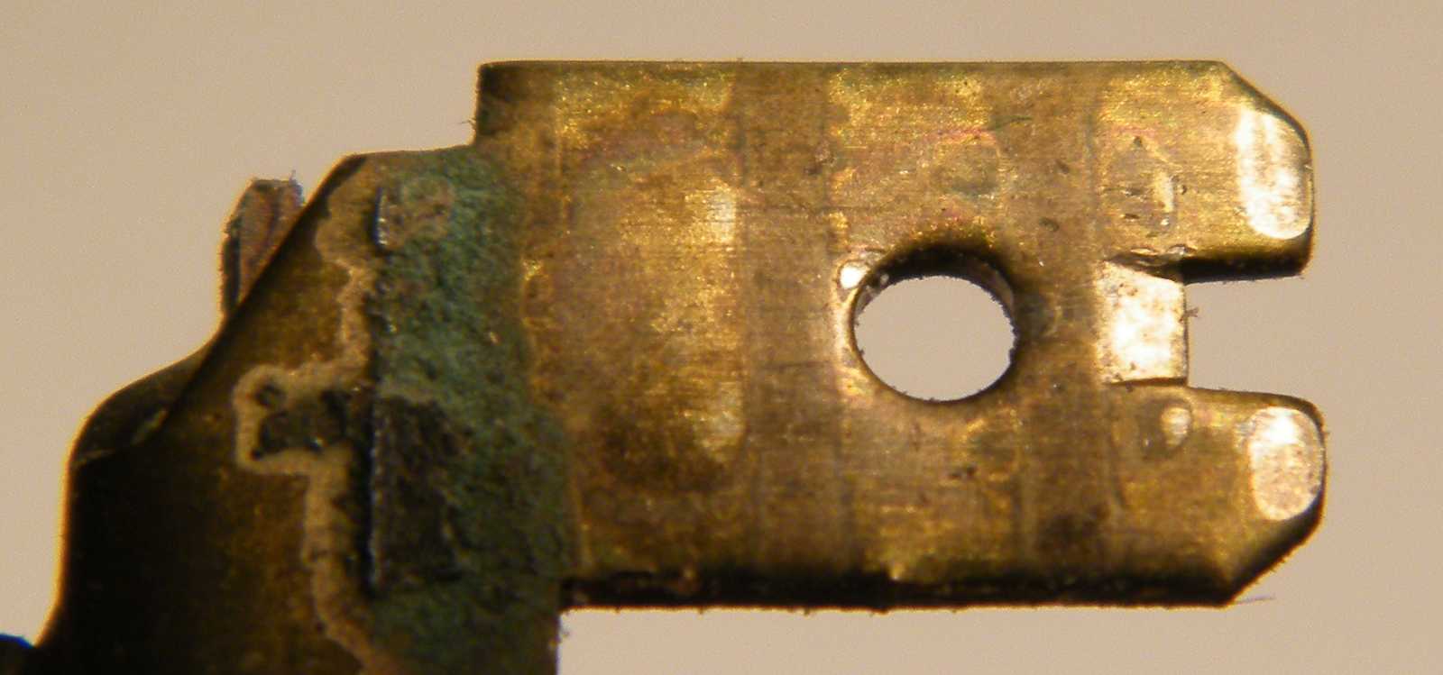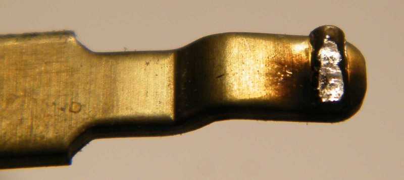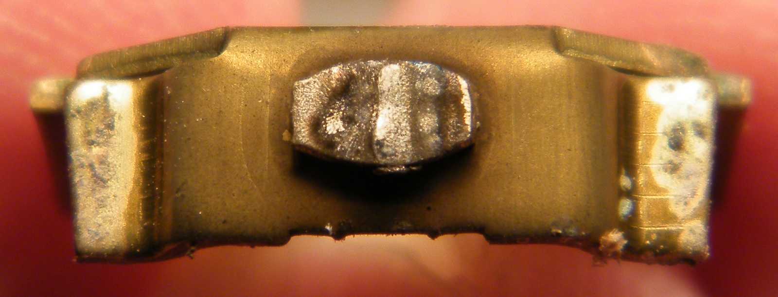 Az ok igen nagy valószínűséggel az átmeneti ellenálláson keletkezett hő volt, ami idővel meglágyította az anyagot. Ennek eredménye kitűnően látszik az egymásmellé helyezett érintkezőkön. |