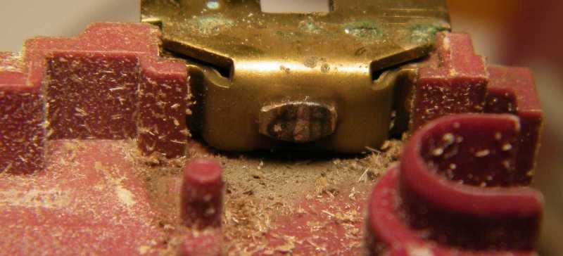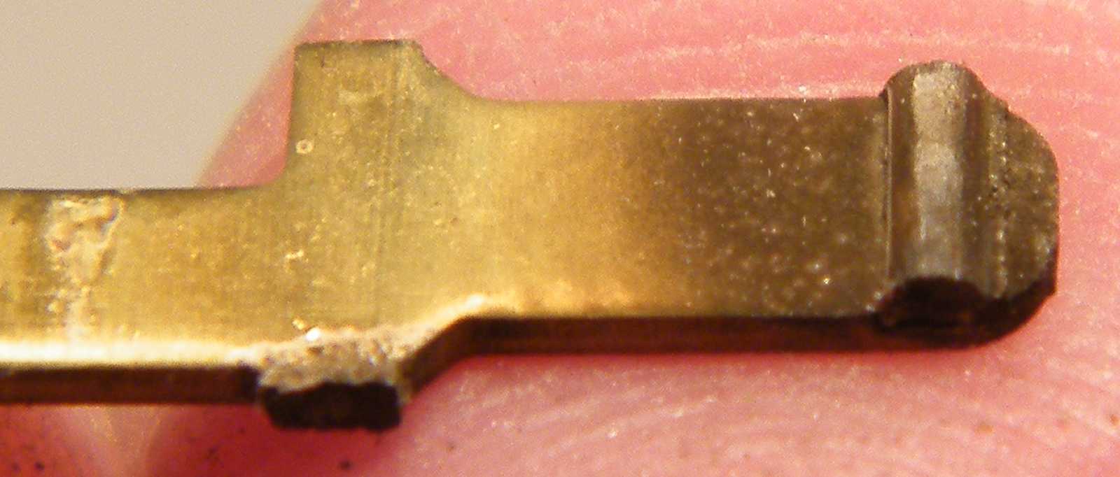 Az előző képen látható érintkezőt közelebbről megnézve, azon a kapcsolókar érintkezőjétől eltérő helyen is (lásd balra) látható egy fekete korommal körbevett szikranyom. Ehhez vagy oda kellett valaminek keverednie, vagy a kapcsoló mondjuk valami induktív feszültségtüske miatt áthúzott. |