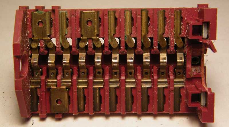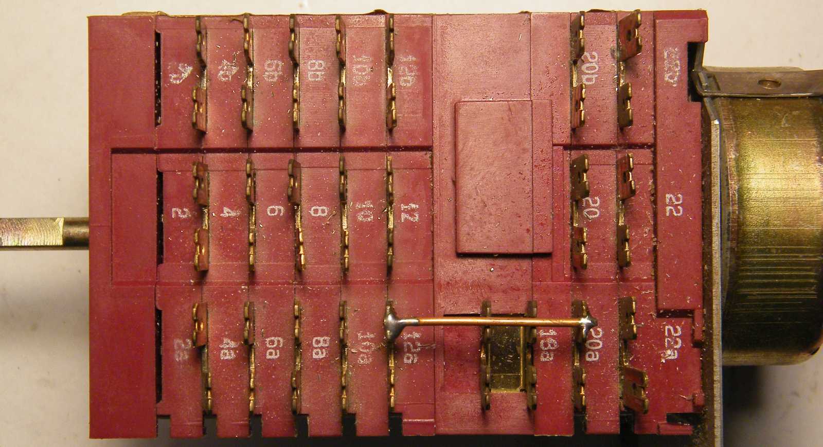 Így, hogy már nincsenek útban a vezetékek, egészen jól olvashatók a számok. Most már persze mindegy... Akarom mondani, a kapcsoló a helyére bekötve már csak azért sem volt szétszerelhető, mert bár ezen az oldalán csak egy, a másikon azonban több átkötés is volt, amitől az egyes elemi kapcsolók nem voltak szabadon szétfordíthatók. |