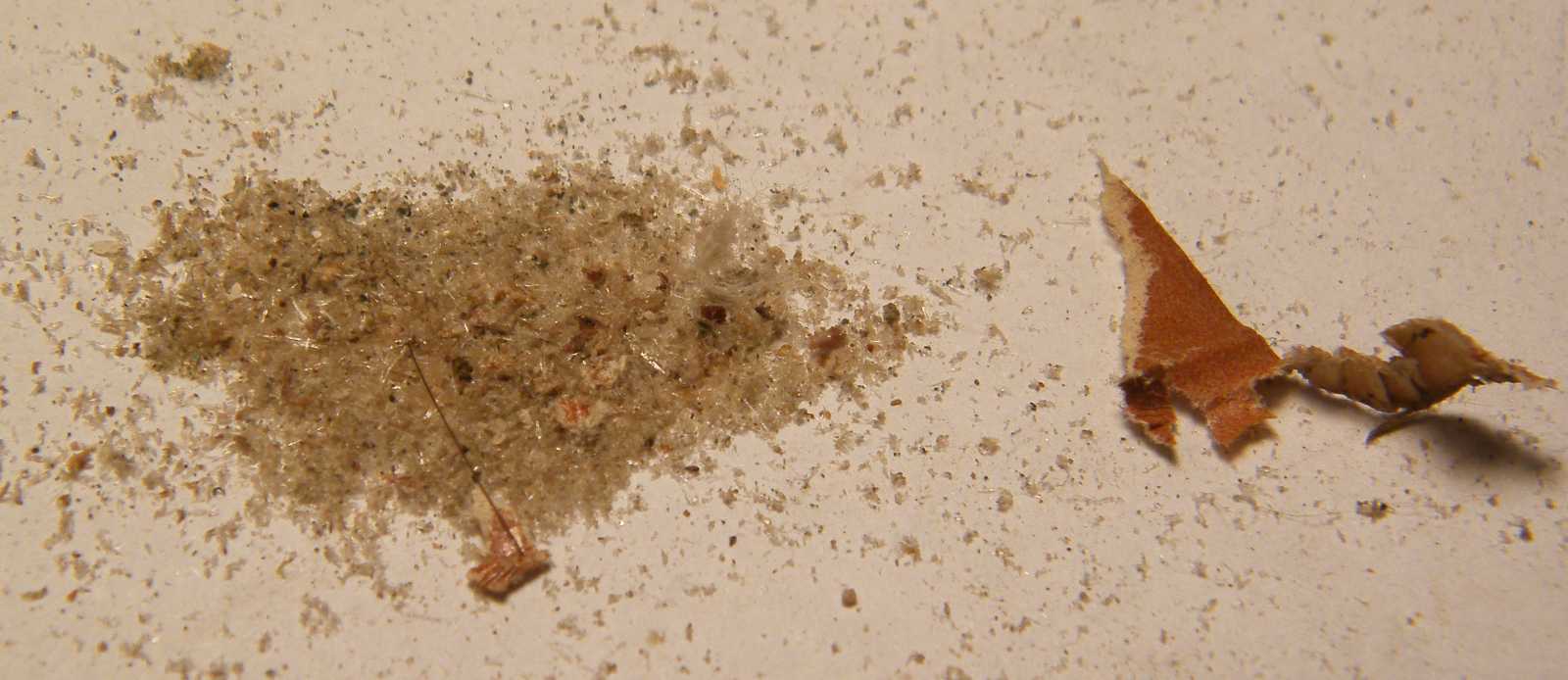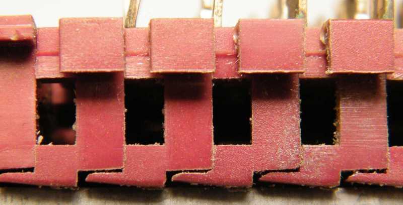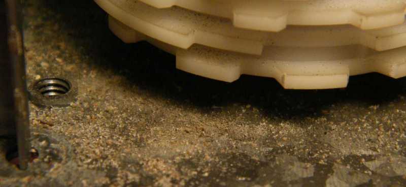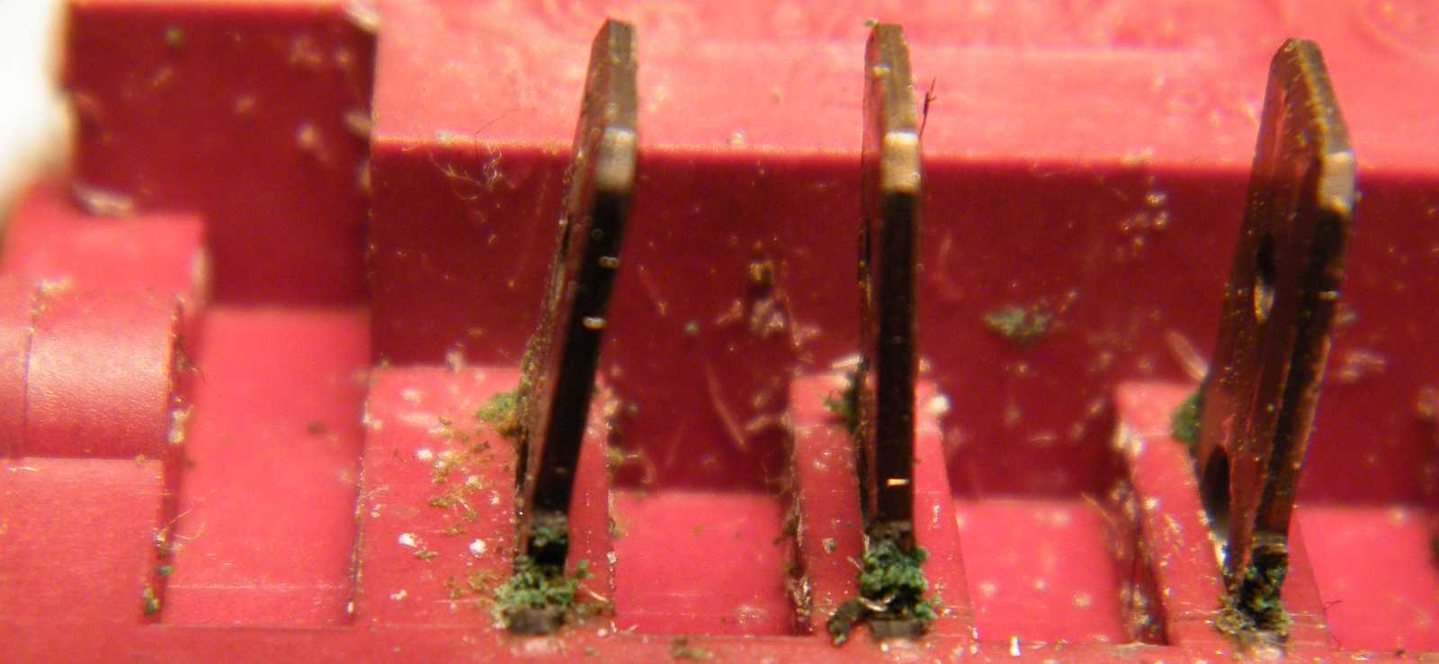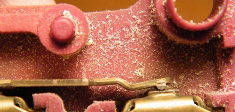 Ez a kép két egymásra helyezett kapcsolómodult mutat. Mivel a balra lent látható lyukban valaha egy fogaskerék műanyag tengelye forgott, ahol is a többi helyszínnél sokkal több a por, ezért elképzelhető, hogy a por egy részét a mozgást végző alkatrészek kopása termelte. |