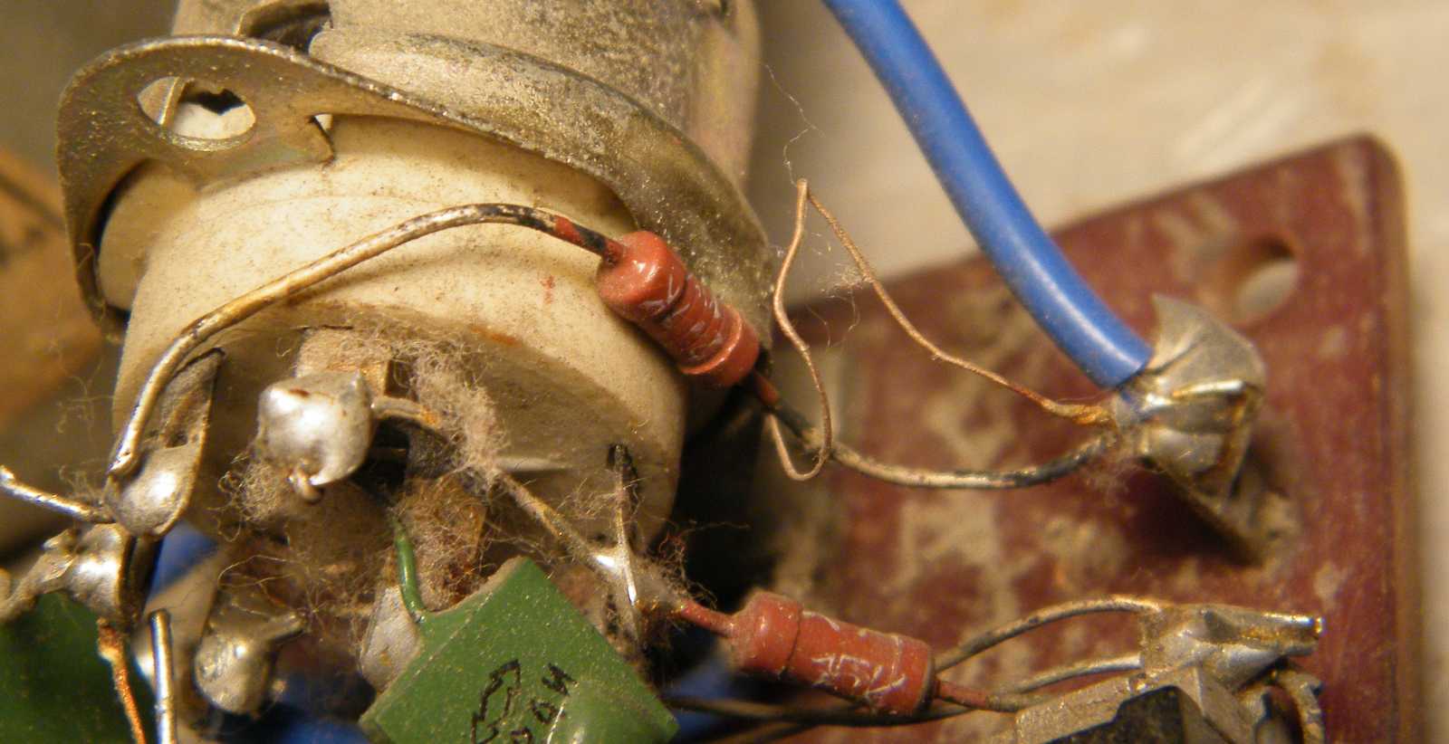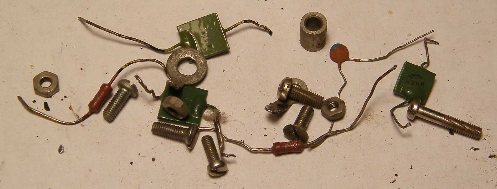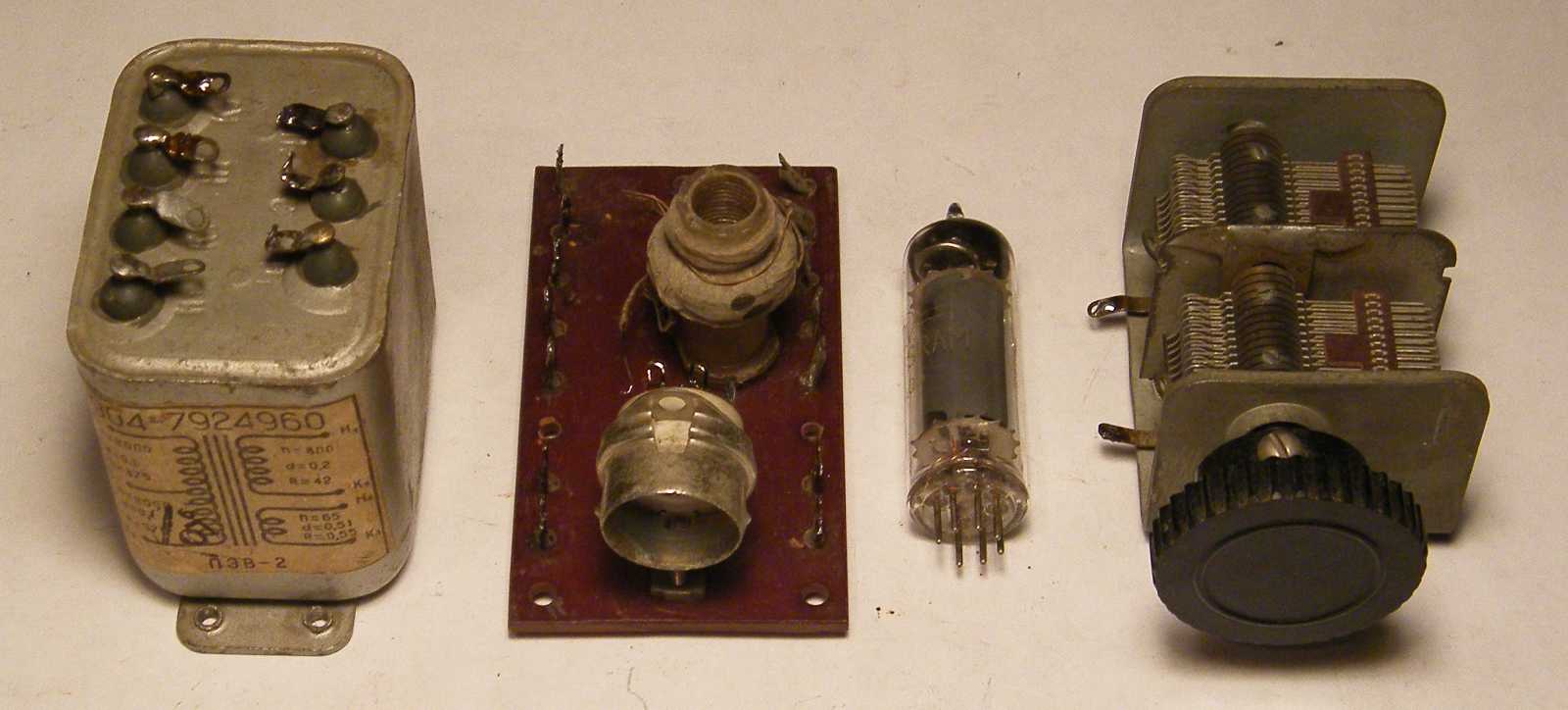 Bár az anódfeszültség szűrésére szolgáló elkót nem találtam, de az a hosszúkás fekete valami esetleg lehet dióda. Mármint a szovjet pajtásoknak nagyon is voltak a megszokottól teljesen elütő formájú alkatrészeik. Ebben az összeállításban meg ugye elég sok szovjet alkatrész található. |