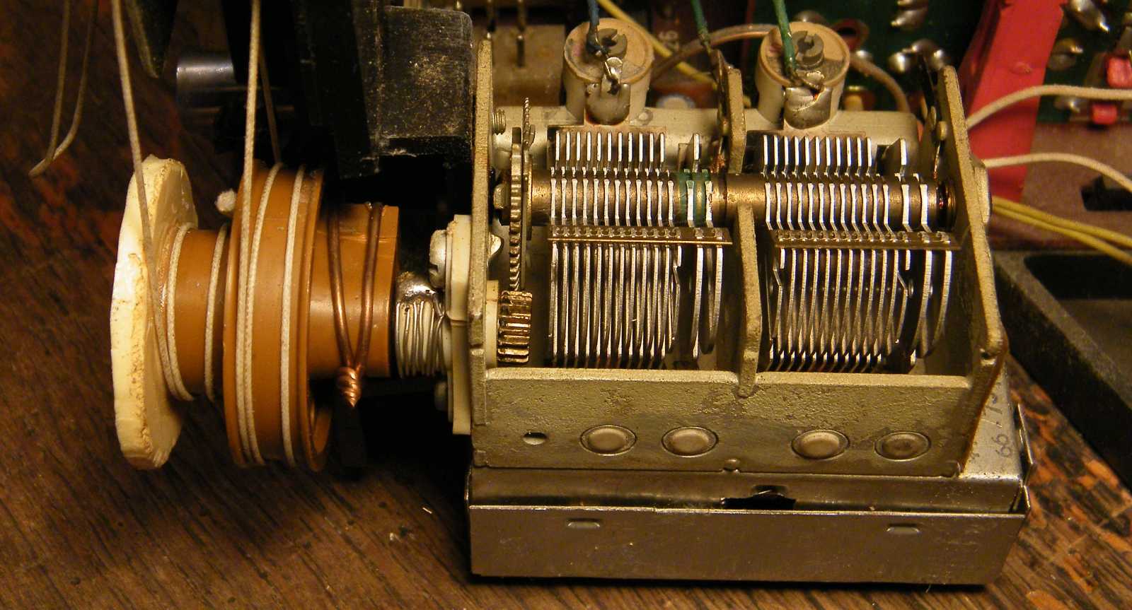 Hogy nem először járok erre, arra kitűnő bizonyítékkal szolgál a forgókondenzátortól balra látható mókolás. Miután a forgó tengelye megszorult, nemcsak annak csapágyazása tört ketté, hanem a tengelyt meghajtó skáladob is elengedett, mely hibát a skálahúr leugrását megakadályozó perem alacsonysága tetézett meg, mely hibát végül - a tőlem kitelő zseniális módon - egy pluszban odaragasztott fehér műanyag lapocskával elimináltam. |