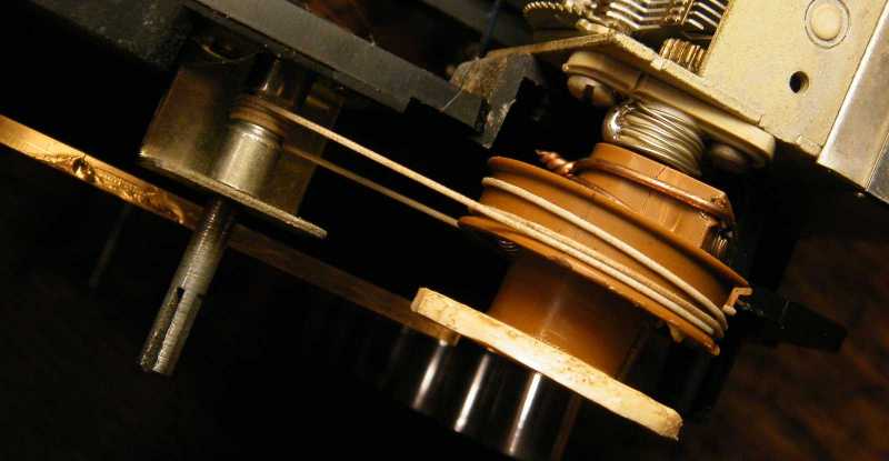 A korábban látott, a hangszóró mágnese vonzotta apró rugó a forgókondenzátor fehér négyzettel jelölt részei közül akadt ki. Amúgy valaha ez (mármint az apró rugó) biztosította, hogy a fogaskerekes meghajtásnak ne legyen kotyogása. |
