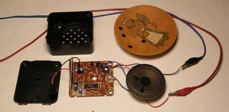 Miközben a dobozból kilógó piros és fekete vezeték végéről a telepcsatlakozó hiányzik, addig erre a két lábra az elektronika működését beindító nyomógomb vezetékei valók, melyek eredetileg a medve egyik lábába épített nyomógombban végződtek. |
