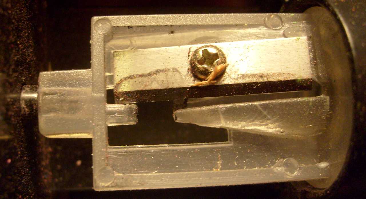 A kék színű szemetes fiókon keresztülnézve, így néz ki a tulajdonképpeni ceruzahegyező, ami amúgy éppen olyan felépítésű, mint bármelyik egyszerű kézi, csak ezt ugye motor forgatja. |