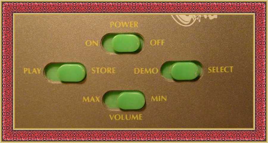 A power gombbal lehet bekapcsolni. A play / store a játék és a tároló funkciót váltaná. A játék még csak ment, de hiába is próbálkoztam, nem tárolta el amit klimpíroztam. Az persze lehet, hogy a hangszer zenei érzéke tiltakozott a virtuóz billentyűkezelésem ellen. A demo / select kapcsolóval azt lehet kiválasztani, hogy mi játszunk az orgonán, vagy ő maga. A volume pedig a hangerő, már ha lehet ezt a sipítást hangerőnek nevezni. |