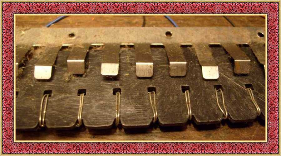 A rugózó részeket nyomjuk neki a billentyűkkel az ellenállások műanyag lapra tekert lábainak. Ide kéne egy fotó az orosz játékorgonáról, hogy lássuk a bóvli és bóvli közti különbséget. Az említett orosz hangszerben ugyanis fél kiló vastagon ezüstözött rézből voltak a kontaktusok. |